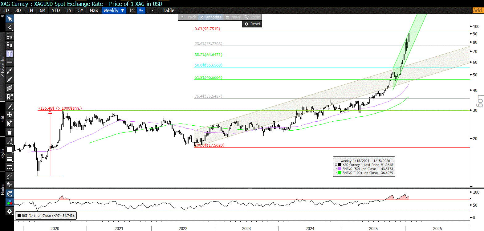 AT tygodniowy: notowania srebra są w fazie hiperbolicznych wzrostów i do póki trend nie został zanegowany to trwa. Istotnym oporem jest aktualny szczyt (ATH) na 93,75 oraz psychologiczny poziom 100. Silne wykupienie na RSI (84 pkt.) obrazuje mocne momentum, przy czym dopiero zejście poniżej strefy 80-75 zaneguje pro wzrostowy układ.