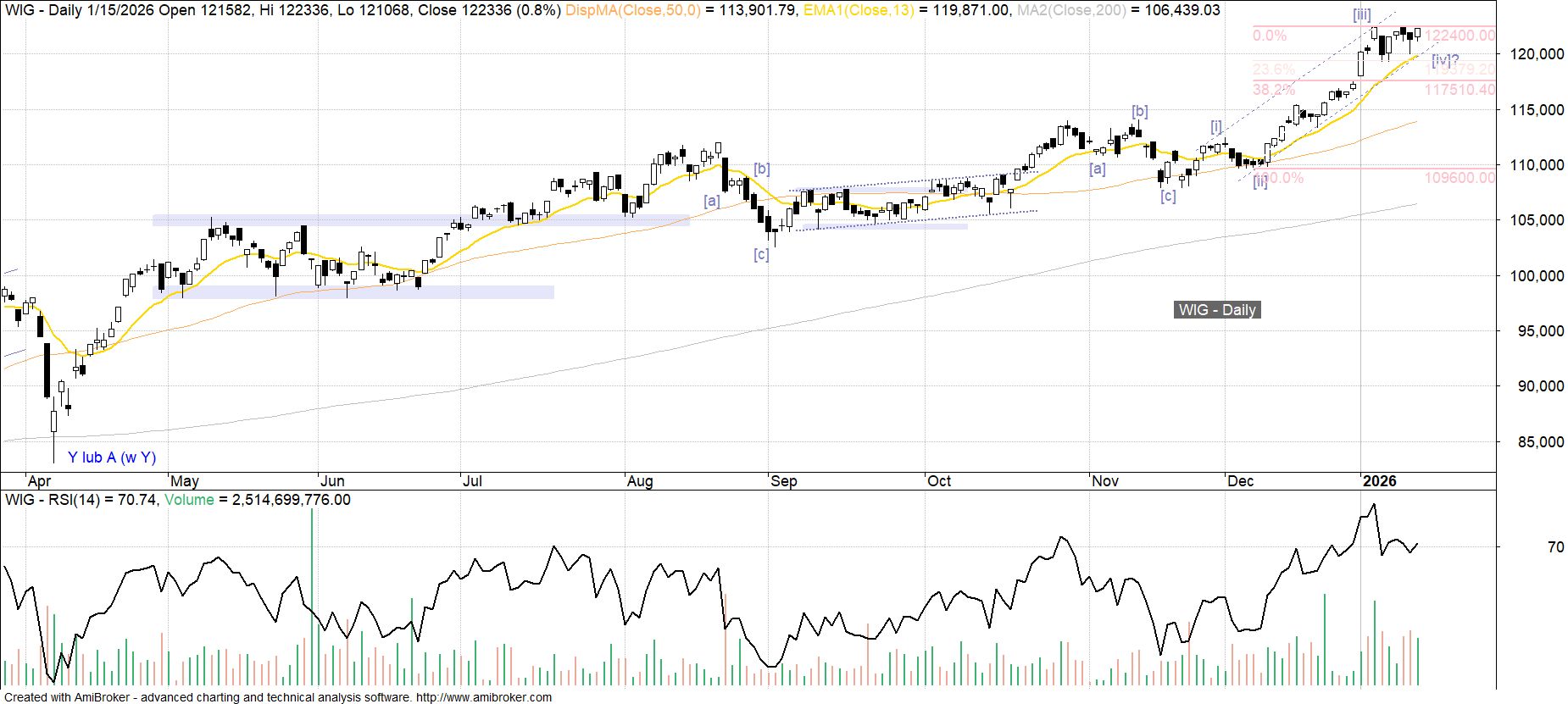 W perspektywie liczonej od lokalnego dna WIG z 21 listopada (zakończenie ostatniej korekty [a][b][c]) preferowany jest scenariusz 5-falowego impulsu, w którym trwający od drugiej połowy minionego tygodnia ruch boczny byłby składową korekcyjnej fali [iv]. Dotychczasowe zniesienie fali [iii] tylko symbolicznie przekroczyło pułap 23.6%, tymczasem statystyka dla fal [iv] mówi, iż zniesienia mniejsze niż 38.2% zdarzają się zaledwie w 15-stu procentach przypadków. Tak więc mimo iż domniemana fala [iv] zrównała się już długością z falą [ii] – co dopuszczałoby możliwość jej zakończenia i przejścia do końcowej wzrostowej fali [v] – nadal dość prawdopodobna jest jej dalsza rozbudowa w formie płaskiej, bądź nawet pogłębienie co najmniej do ok. 117.5 tys. pkt.