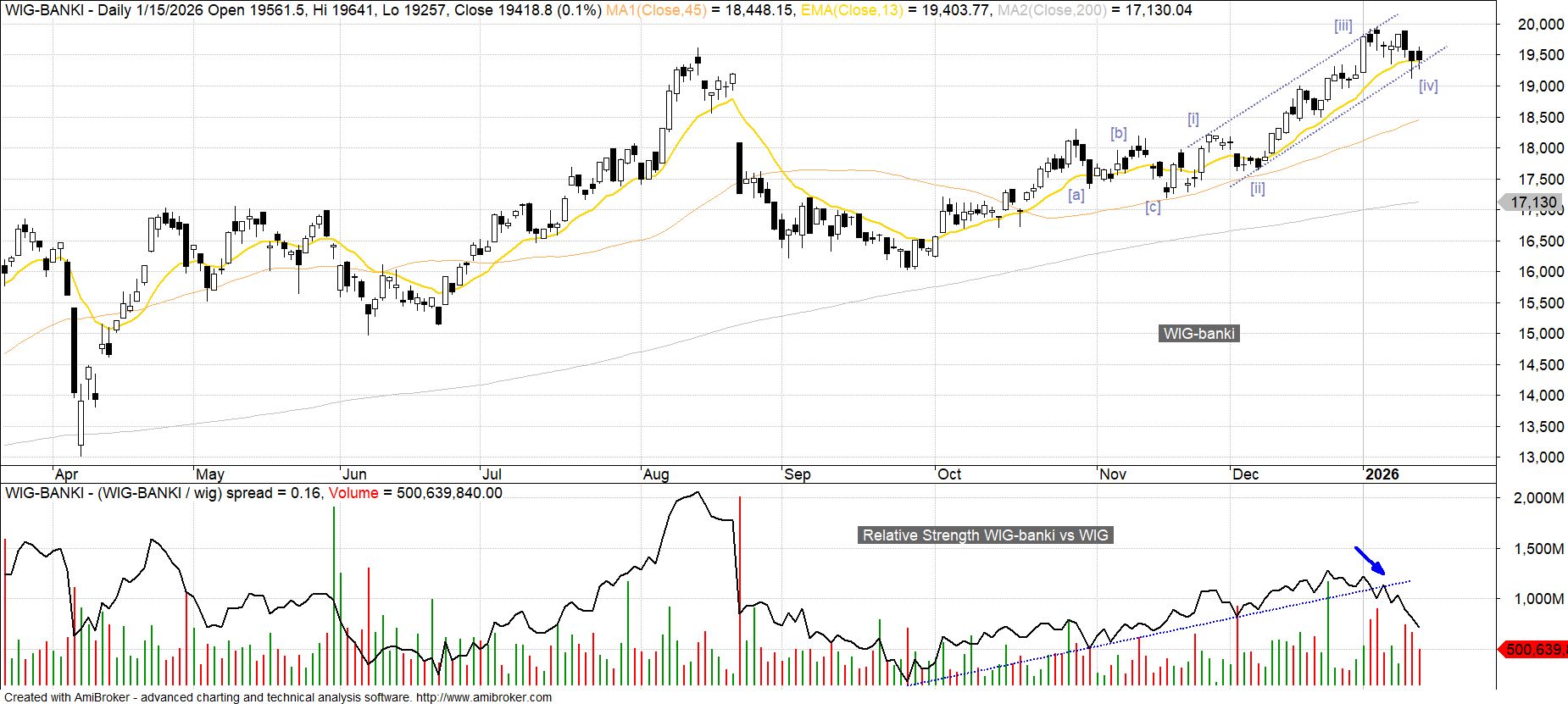W przypadku sektorowego indeksu WIG-banki struktura falowa budowana od czasu listopadowego dołka jest analogiczna, jak dla WIG, z tym, że trwająca od 7 stycznia domniemana korekcyjna fala [iv] przebiega tu w bardziej typowy sposób, zarówno pod względem geometrii (zygzak w miejsce w fali płaskiej), jaki i głębokości zniesienia fali [iii]. Oczekiwania co do kształtu końcowej wzrostowej fali [v] w potencjalnym 5-falowym impulsie są tu natomiast ograniczone z uwagi na zaznaczającą się od początku roku relatywną słabość, a jedną z opcji jest także możliwość jej budowy w formie załamanej, czyli bez przekroczenia szczytu 19 957 pkt.