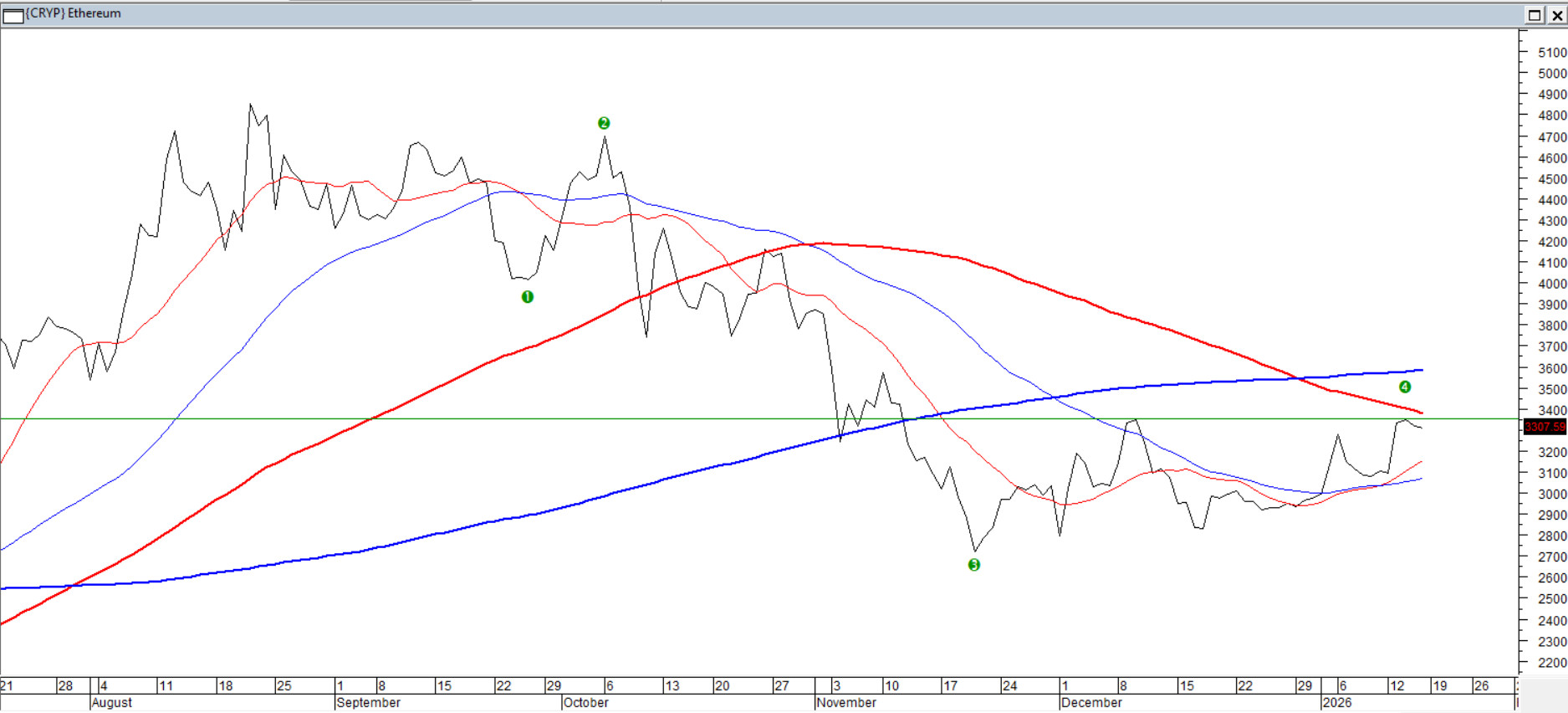 Kurs drugiej najbardziej popularnej kryptowaluty po Bitcoinie, podszedł pod grudniowy opór. To powinno dać bykom dodatkową motywację do kontynuowania ruchu w górę. Niestety kurs zatrzymał się w strefie oporu średnich 100/200, mając za sprzymierzeńców kontynuacji wzrostów jedynie średnie krótsze 15/45. Na domiar złego cała obecna sekwencja nie jest jednoznaczna, a obecny układ można równie dobrze wpisać w charakter kończącej IV fali z potencjalnym przygotowaniem do kolejnej fali przeceny.