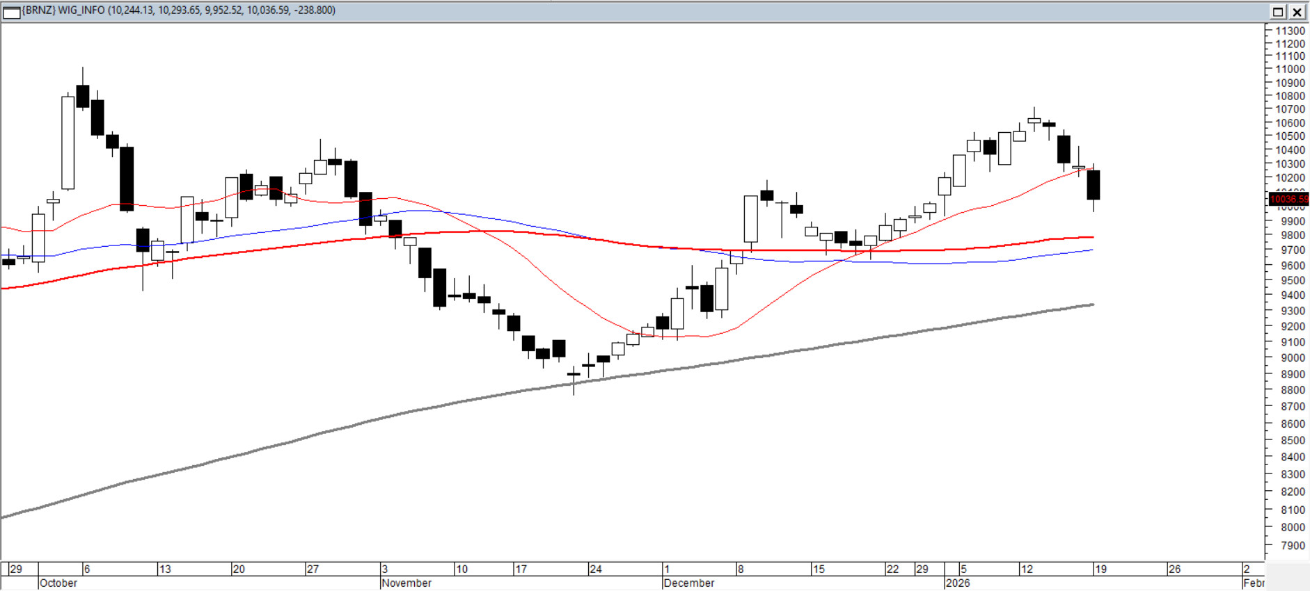 Podczas poniedziałkowej sesji indeks informatyki spadł o 2,3%, wydłużając korektę względem tej z grudnia i sygnalizując, że presja podaży mogła jeszcze nie wygasnąć. Z perspektywy długoterminowej układ pozostaje jednak stabilny — średnia 200-sesyjna, nienaruszona od blisko dwóch lat, przebiega około 7% niżej i wciąż podtrzymuje trend. Krótkoterminowo obraz komplikuje się: średnie 15/45 tracą czytelność, co często towarzyszy fazom przejściowym i zapowiada rozstrzygnięcie kierunku w kolejnych sesjach.