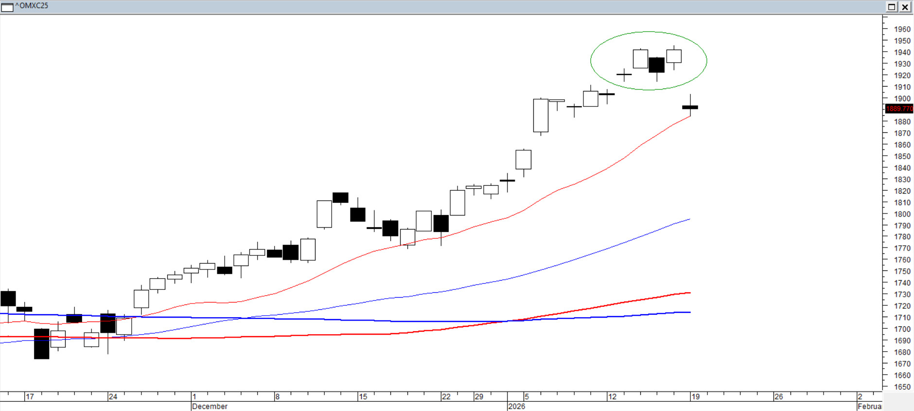Weekendowe wydarzenia wokół Grenlandii odbiły się na nastrojach w Kopenhadze — najważniejszy indeks tego kraju stracił 2,7%. Sesja przyniosła otwarcie okna bessy, a w strefie ostatnich szczytów ukształtowała się rzadko spotykana niedźwiedzia "wyspa odwrotu", statystycznie sprzyjająca kontynuacji ruchu i przejmowaniu inicjatywy przez podaż. Jednocześnie obraz trendowy pozostaje relatywnie mocny: średnia 45-sesyjna przebiega ponad 5% niżej, a średnie ze 100 i 200 sesji — podtrzymujące długoterminowy układ — nie zdążyły jeszcze „dogonić” zwyżki rozpoczętej wraz z ostatnim miesiącem ubiegłego roku.