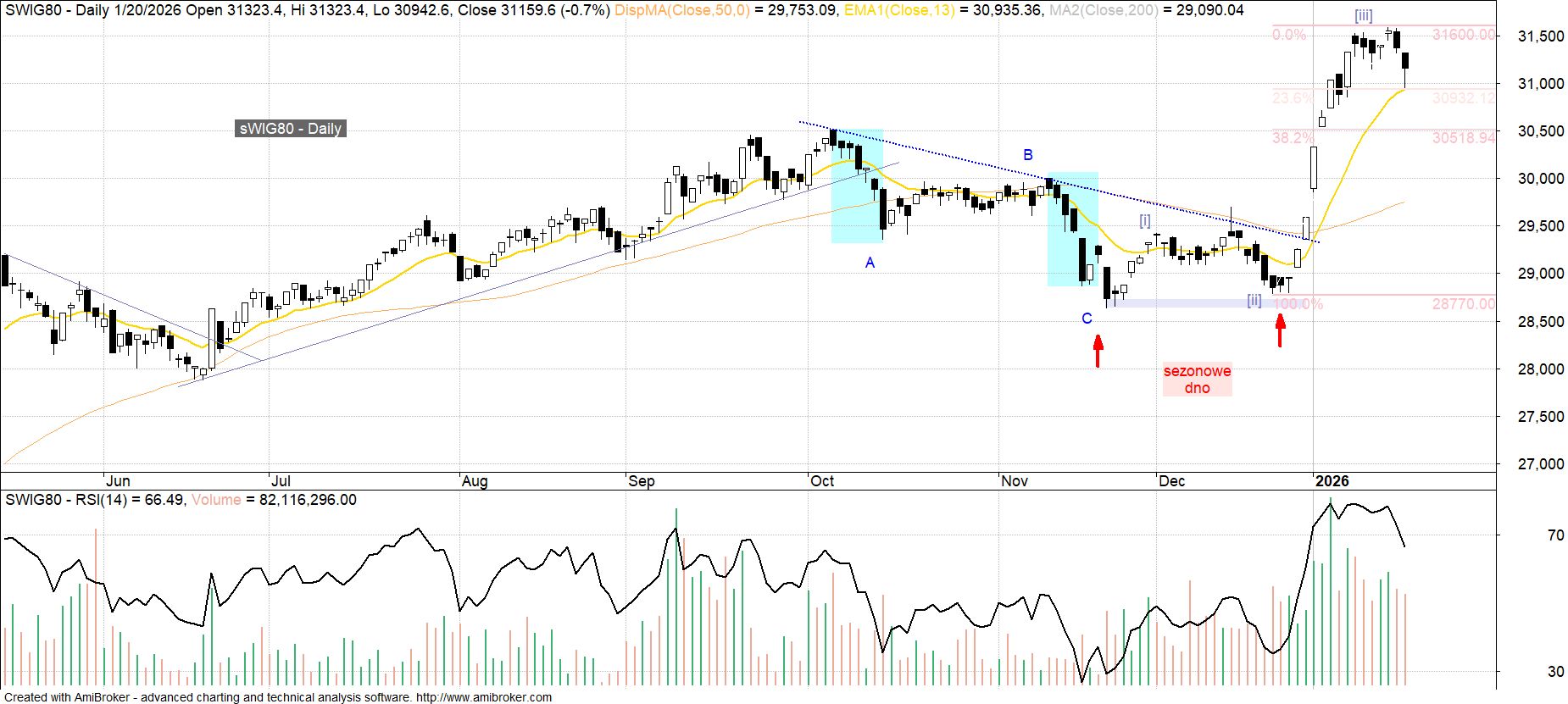 Dynamiczny ruch wzrostowy sWIG80 z przełomu roku nosi wszelkie cechy fali [iii] w potencjalnym 5 falowym impulsie budowanym od czasu zakończenia korekty ABC z poprzedniego kwartału. W tym układzie najbardziej typowy zasięg korekty w ramach prawdopodobnie trwającej fali [iv] lokuje się z zakresie 23.6%-38.2% zniesienia fali [iii] (30.5 - 30.9 tys. pkt).