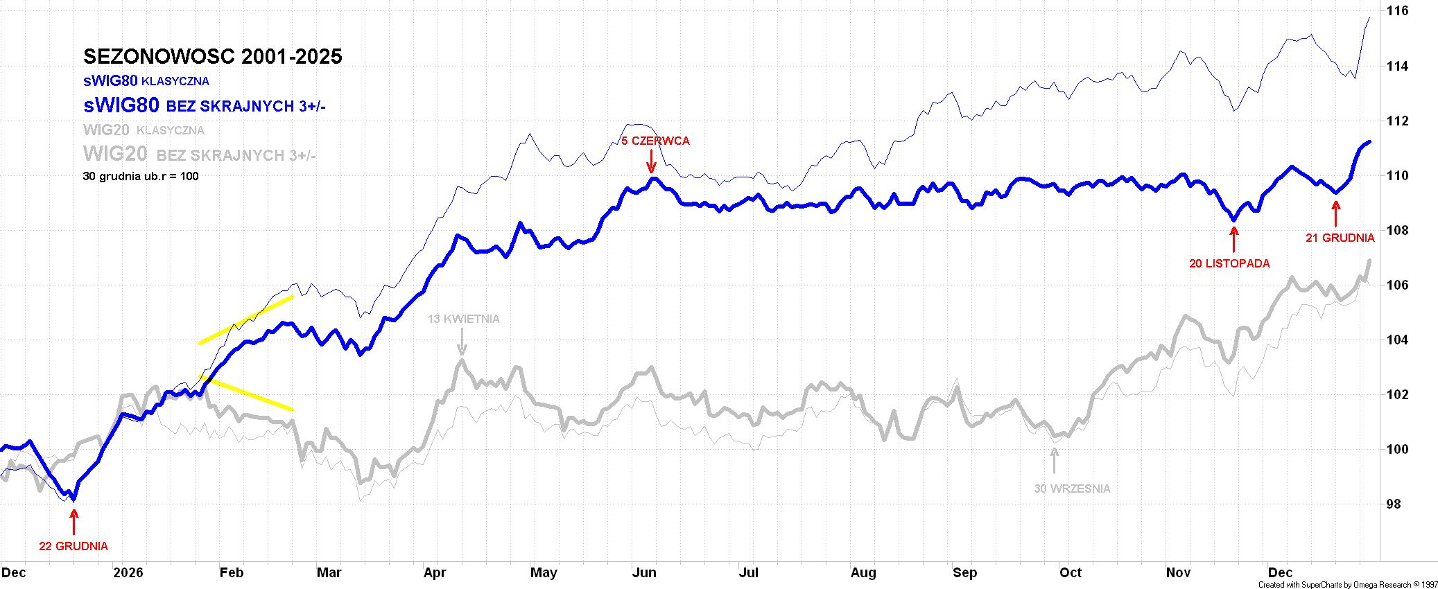 Jednocześnie warto podkreślić, iż ostatnie wzmocnienie małych spółek po okresie słabości z 4Q’25 jest zgodne z ogólnymi zależnościami obserwowanymi w przeszłości. Z porównania klasycznych wykresów sezonowych dla WIG20 i sWIG80 wynika, iż IV kwartał to zasadniczo jedyny okres w roku, kiedy małe spółki przeciętnie zachowują się gorzej niż duże (zmiany za 4Q’25 wyniosły dla obu omawianych indeksów odpowiednio +12.7% i -1.3%). Natomiast od sezonowego dna z trzeciej dekady grudnia do zamknięcia wczorajszej sesji sWIG80 zyskuje 8.0%, podczas gdy zmiana WIG20 w tym samym czasie wynosi 3.9%. Tą różnicę można na razie rozpatrywać w kategoriach nadrabiania wcześniejszych zaległości w relacji do WIG20, natomiast przewaga małych spółek nad dużymi zwyczajowo powinna stawać się coraz wyraźniejsza począwszy od końca stycznia.