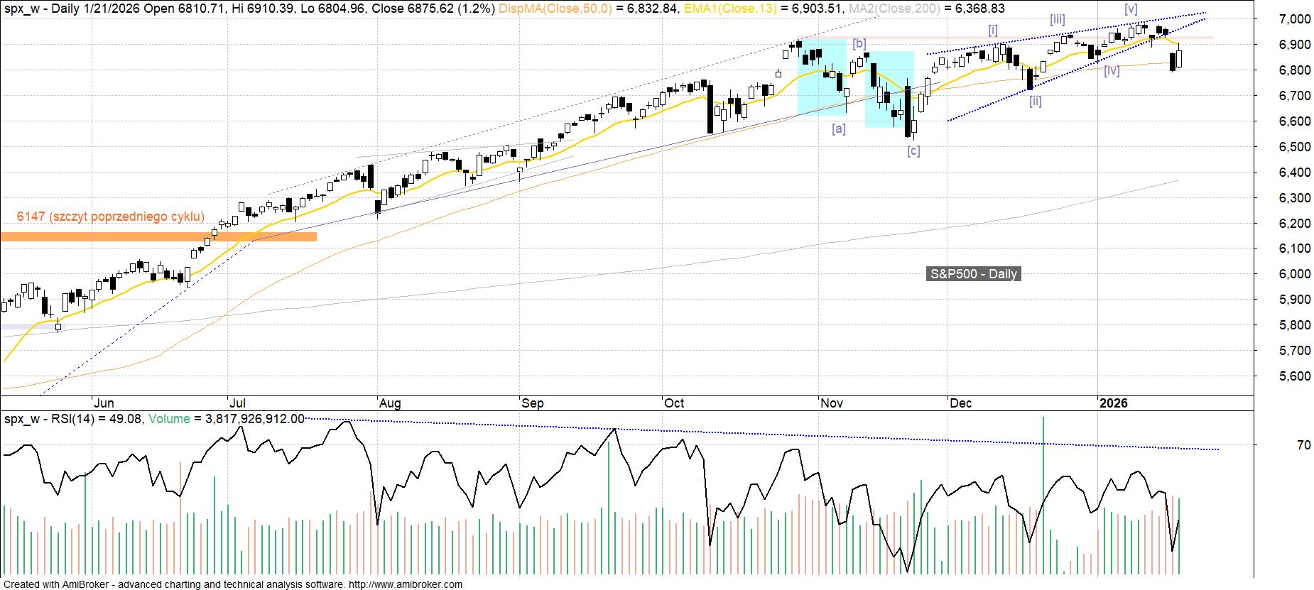 Fala wzrostowa, jaka pojawiła się po lokalnym dnie z 21 listopada (zakończenie ostatniej korekty [a][b][c]) przyjęła w przypadku S&P500 postać kończącego klina, który na początku bieżącego tygodnia został opuszczony dołem. Przy okazji nie udało się utrzymać niedawnego wyjścia ponad szczyt 6 920 pkt z końca października, co wzmacnia pro-spadkową wymowę obecnego układu. Wczorajsza sesja przyniosła próbę ruchu powrotnego do dolnego ograniczenia wspomnianego na wstępie klina (obecnie ok. 6 980 pkt), która wobec braku podobnie ostrzegawczych sygnałów ze strony pozostałych rynków bazowych (Europa i segment EM) ma szansę zostać przedłużona. Odnośnie dłuższych perspektyw warto dodać, iż historycznie rzecz biorąc, słabsze zachowanie amerykańskiego rynku akcji jest wyróżnikiem pierwszych trzech kwartałów rozpoczynającego się właśnie drugiego roku w 4-letnim cyklu prezydenckim.