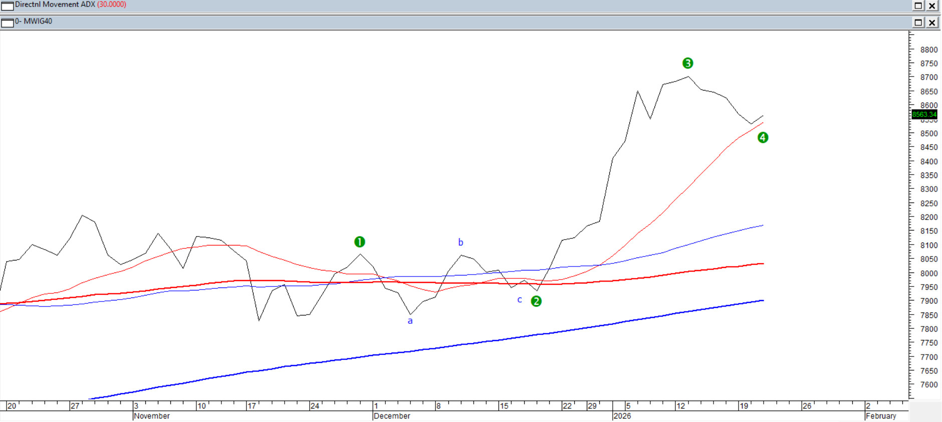 Spadek, który pojawił się na „misiach” w drugiej dekadzie stycznia, można bez przeszkód zaliczyć do klasycznie elliottowskiej czwórki – fazy korygującej po długim, zimowym marszu byków w górę. W efekcie średnie średnioterminowe 45/100/200 zwyczajnie nie nadążają za obecną zwyżką, a szybka MA(15) przejmuje rolę najbliższego, potencjalnego wsparcia. Do scenariusza i życzeń nowego szczytu oraz kolejnych rekordów dołącza się ADX(14), który utrzymując się w rejonie 30 pkt, potwierdza utrendowienie i sprzyja kontynuacji ruchu trendowego po stronie byków.