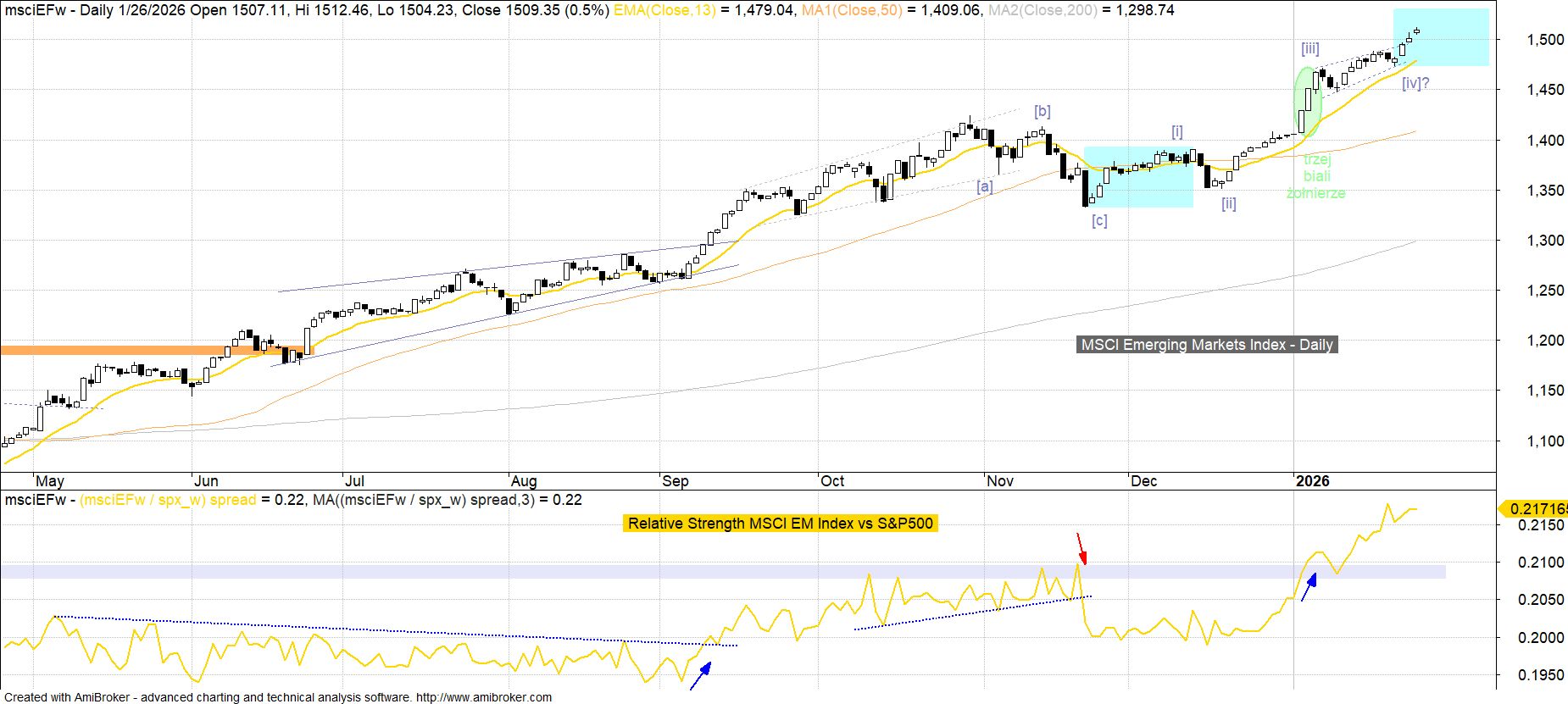 Rynki wschodzące rozpoczęły bieżący rok świecową formacją trzech białych żołnierzy o zdecydowanie byczej wymowie oraz sygnałami kontynuacji relatywnego wzmocnienia względem S&P500. Interpretacja 5-falowego impulsu wzrostowego budowanego od czasu dołka z 21 listopada (zakończenie ostatniej korekty [a][b][c]) nie jest tu jednoznaczna. Jedną z możliwości sugerowanych przez zachowanie RSI jest przebieg fali [iv] w formie pędzącej, a zasięg dla trwającej obecnie fali [v] sugerowany przez porównanie z falą [i] wynosiłby ok. 1 530 pkt.