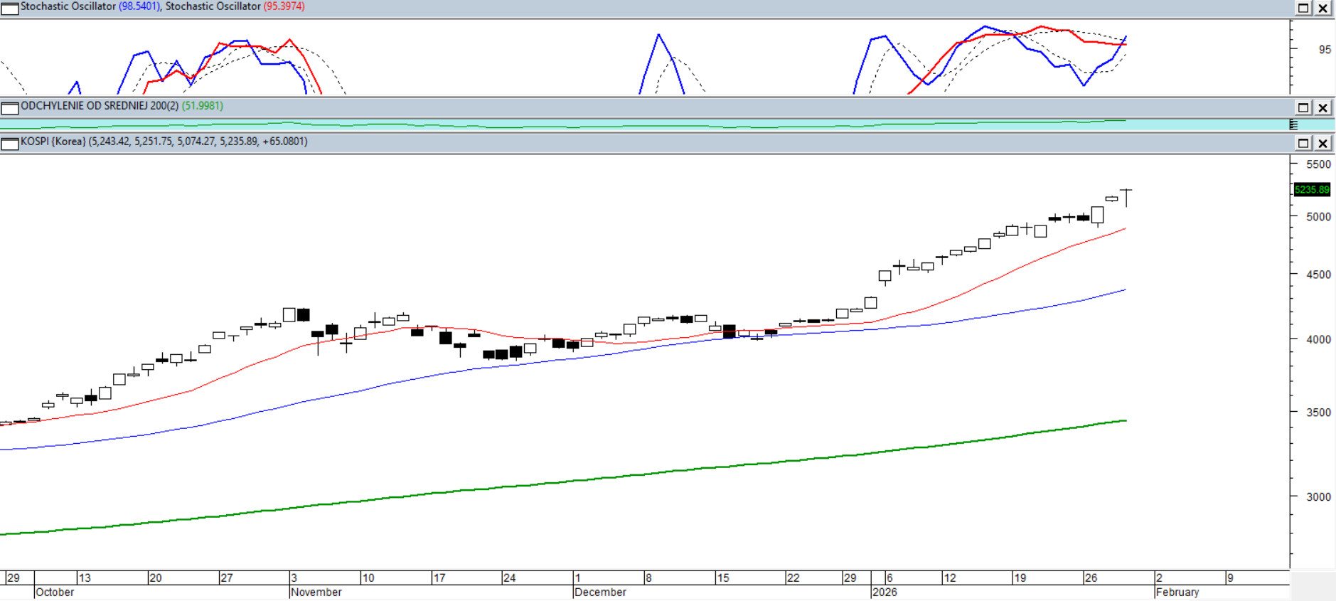 Główny indeks giełdy w Seulu, osiągnął odchylenie od średniej z 200 sesji przekraczające +50%. To poziom, który nie występował wcześniej w tym wieku, co istotnie podnosi ryzyko dla spóźnionego popytu. Można ten stan nazwać euforycznym i jak wiadomo często taki potrafi zmienić się nierzadko w krótkim czasie w panikę. Oscylatory szybkie i wolne od dłuższego czasu utrzymują się powyżej 95 pkt, sygnalizując ekstremalne wykupienie. Przy takiej konfiguracji oczywiście uczestników rynku nie zdziwi możliwość wystąpienia korekty porządkującej, póki co mieszczącej się w ramach obowiązującego trendu wzrostowego,