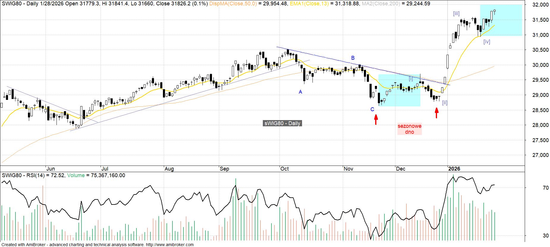 Dynamiczny ruch wzrostowy sWIG80 z przełomu roku nosi wszelkie cechy fali [iii] w potencjalnym 5-falowym impulsie budowanym od czasu zakończenia korekty ABC z poprzedniego kwartału. W tym układzie po korekcie w ramach domniemanej fali [iv] z drugiej dekady stycznia, podstawowym celem na obecnej fali [v] jest pułap 32.0 tys. pkt (reguła równości z falą [i]).