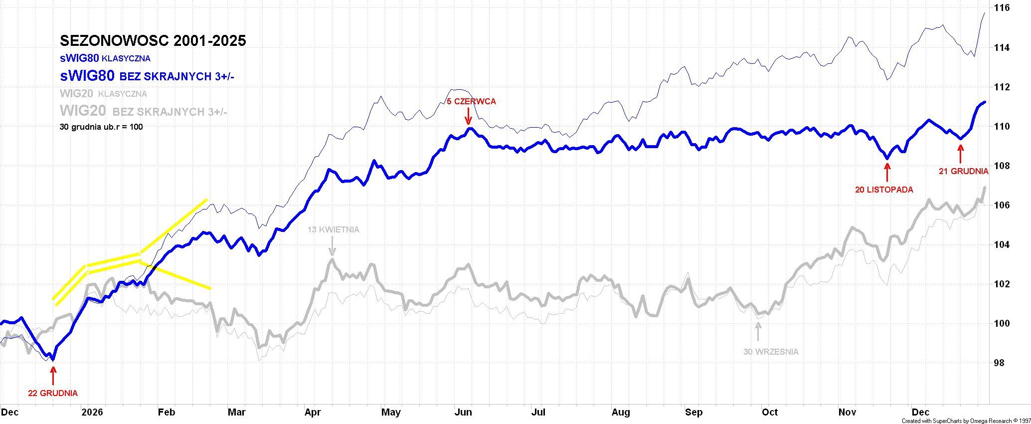 Jednocześnie warto podkreślić, iż ostatnie ożywienie na rynku małych spółek po okresie słabości z 4Q’25 jest zgodne z ogólnymi zależnościami obserwowanymi w przeszłości. Z porównania klasycznych wykresów sezonowych dla WIG20 i sWIG80 wynika, iż IV kwartał to zasadniczo jedyny okres w roku, kiedy małe spółki przeciętnie zachowują się gorzej niż duże (zmiany za 4Q’25 wyniosły dla obu omawianych indeksów odpowiednio +12.7% i -1.3%). Natomiast od sezonowego dna z trzeciej dekady grudnia do zamknięcia wczorajszej sesji sWIG80 zyskuje 10.2%, podczas gdy zmiana WIG20 w tym samym czasie wynosi 6.9%. O ile tą różnicę można jeszcze rozpatrywać w kategoriach nadrabiania wcześniejszych zaległości w relacji do WIG20, to począwszy od przełomu stycznia i lutego przewaga małych spółek zazwyczaj zaznacza się już wyraźniej.