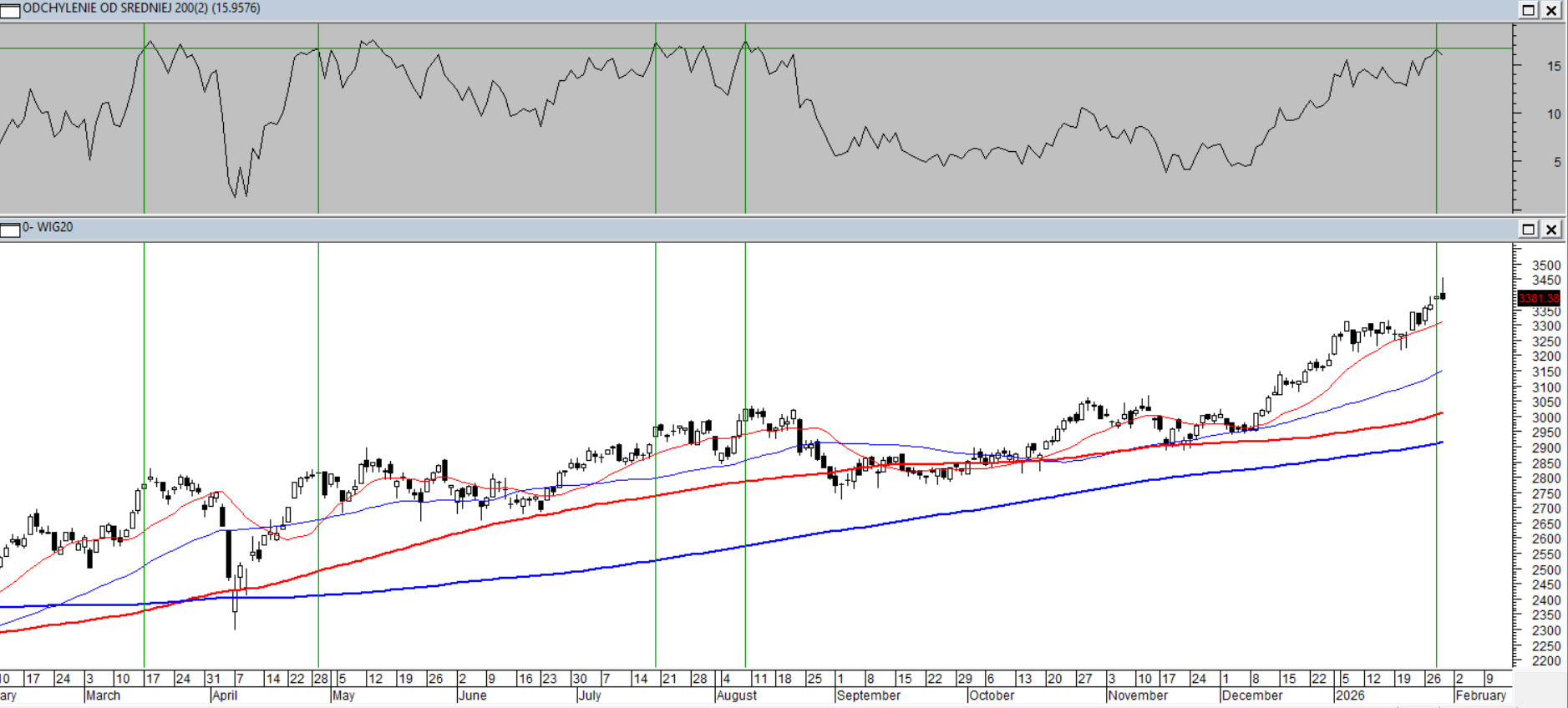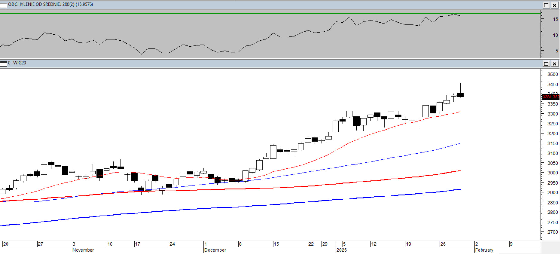 Końcówka czwartkowej sesji należała do podaży – w efekcie kurs oddał wszystko, co zyskał w trakcie notowań. Nawis podażowy w postaci długiego górnego cienia ukształtował formację spadkową, statystycznie słabą, tzw. Spadającą Gwiazdę. Większy niepokój budzi jednak solidne wykupienie oscylatorów szybkich oraz odchylenie od średniej z 200 sesji, które po dojściu w okolice 16% od kilku lat skutecznie wyhamowuje impet trendu wzrostowego na tym instrumencie. Dlatego mimo przyzwoitego ułożenia średnich 15/45/100/200, należy przygotować się na zmianę tempa ruchu, z uwzględnieniem pojawienia się sekwencji spadkowych.