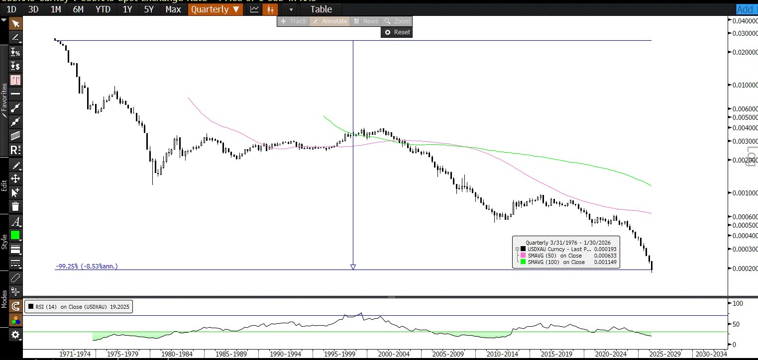 Spadek USD wyrażony w złocie od 1971 r. wyniósł nieco ponad 99%.