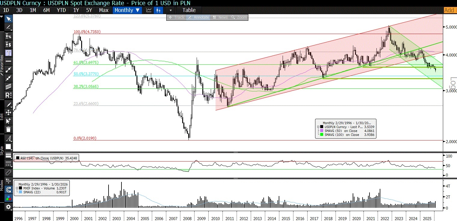 AT miesięczny: najbliższe wsparcie to 3,3076, czyli dołek z kwietnia 2018 r., przy czym co istotniejsze to notowania przełamały 15-letni trend osłabienia PLN i są w trendzie spadku USD/PLN (aprecjacji PLN) poprzedni trend aprecjacji PLN trwał (8 lat) od 2000 do 2008 r.