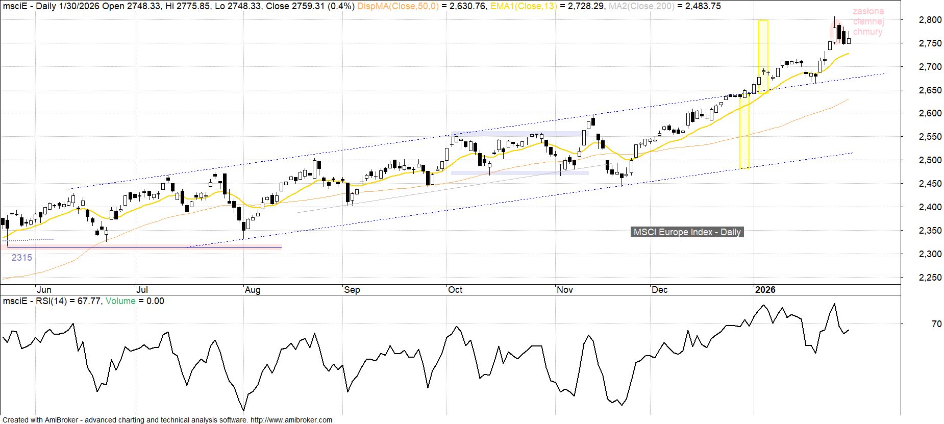 Skupiający 15 europejskich rynków rozwiniętych indeks MSCI Europe w pierwszej połowie minionego tygodnia zrealizował potencjał wzrostowy odpowiadający szerokości opuszczonego kanału z drugiego półrocza (ok. 2 800 pkt), co zbiegło się z utworzeniem potencjalnej świecowej formacji odwrócenia w postaci zasłony ciemnej chmury. Choć jest to układ zdecydowanie sprzyjający korekcie, wspomniana niedźwiedzia formacja do końca tygodnia jeszcze nie została potwierdzona spadkiem poniżej jej dolnej krawędzi (2 746 pkt).