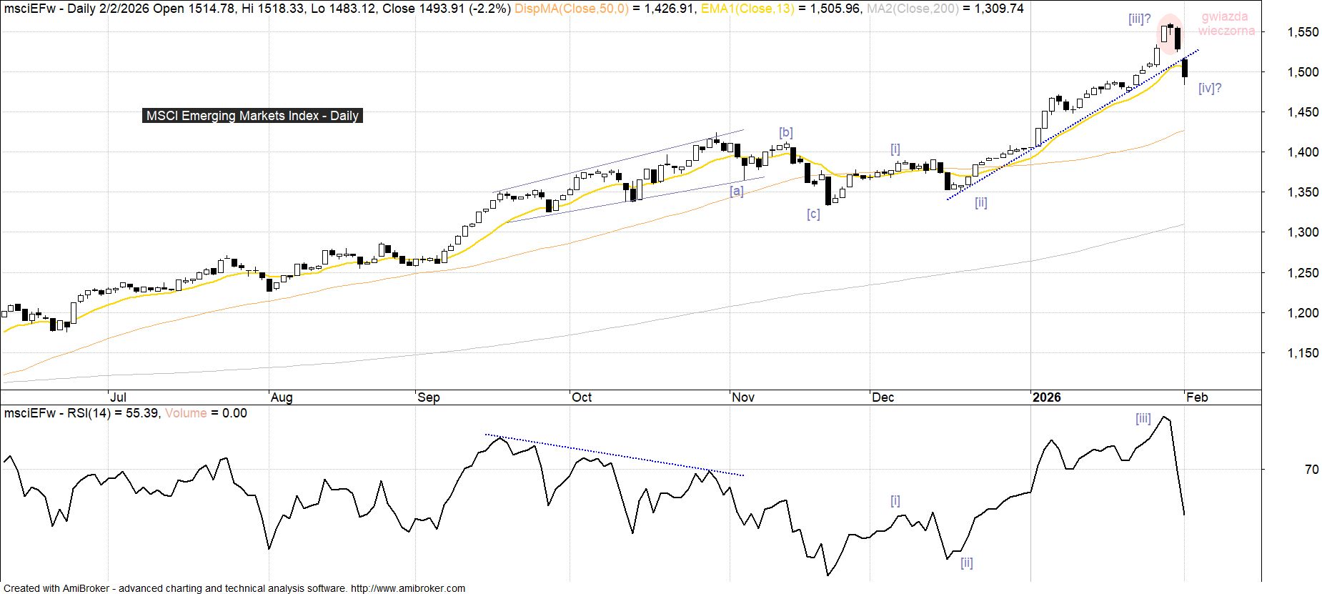 Druga połowa minionego tygodnia na wszystkich rynkach bazowych przyniosła różnego typu świecowe formacje odwrócenia, a w przypadku MSCI Emerging Markets Index była to relatywnie najmocniej niedźwiedzia w wymowie gwiazda wieczorna. Interpretacja 5-falowego impulsu wzrostowego budowanego od czasu dołka z 21 listopada (zakończenie ostatniej korekty [a][b][c]) nie jest tu jednoznaczna. Jedną z możliwości która w największym stopniu byłaby zgodna ze wskazaniami RSI (brak dywergencji) jest przyjęcie założenia o zakończonej w minionym tygodniu fali [iii], co po zakończeniu obecnej korekty zostawia jeszcze możliwość ponowienia zwyżek w ramach końcowej fali [v].