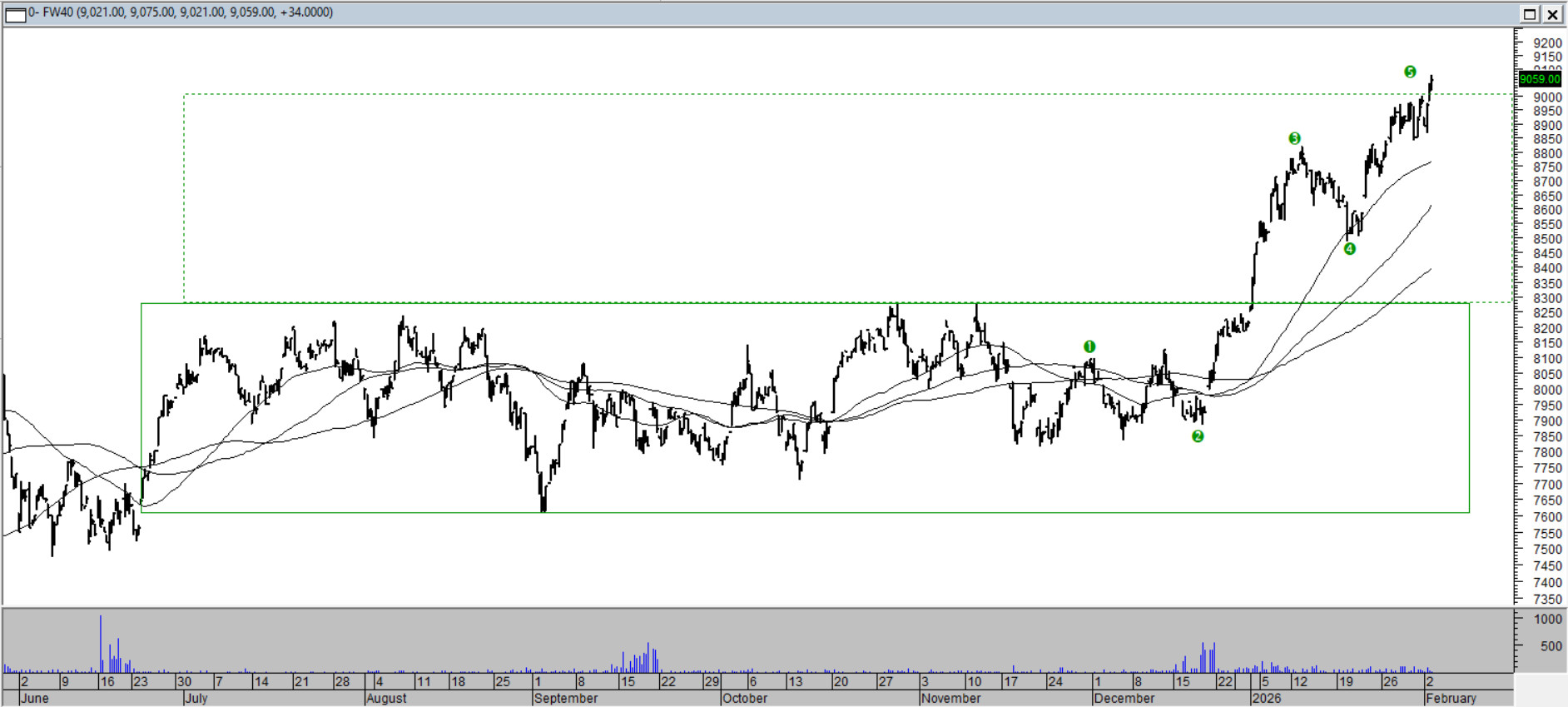 Po wybiciu z wielomiesięcznej konsolidacji, co stało się na początku roku kurs wczoraj zrealizował minimalny zasięg ruchu wynikający z wielkości wspominanego ruchu bocznego. Struktura impulsu wskazuje na realizację fali piątej, bez naruszenia kluczowych poziomów technicznych. I to może być jedyna rysa widoczna obecnie na tym trendowym instrumencie. Średnie z 100, 150 i 200 odcinków są nachylone w górę i nadal prowadzą trend, pełniąc rolę dynamicznego wsparcia.