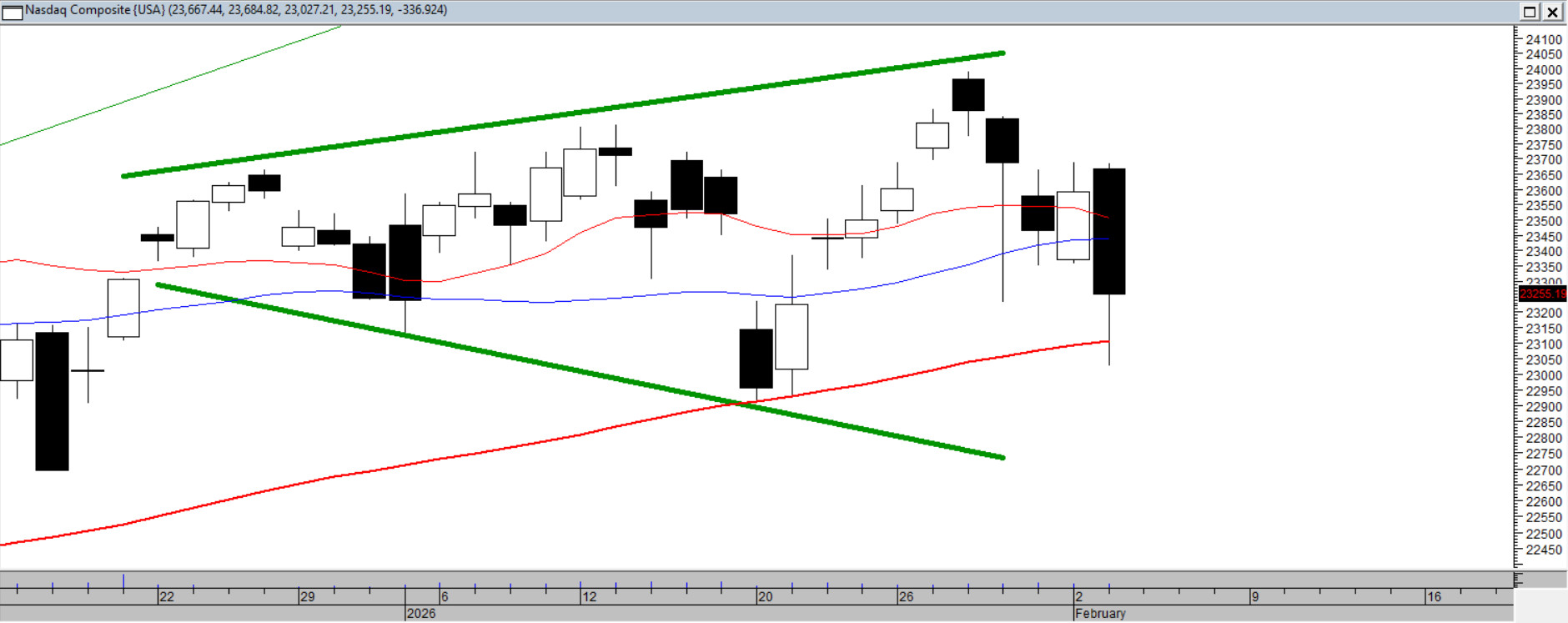 Okres Od Świąt Bożego Narodzenia do dziś dla inwestorów segmentu amerykańskich nowych technologii nie należy do łatwych. Kurs co i raz wybija swoje kolejne lokalne ekstrema i wraca, tworząc charakterystyczny „Megafon”. Stanowi to duże utrudnienie dla wszystkich tych, chcących dołączyć się do aktualnego trendu po wybiciu swoich wsparć lub oporów. Podczas poniedziałkowej sesji szeroki indeks nowych technologii stracił 1,43%, formując klasyczne niedźwiedzie „objęcie bessy”. Średnie 15/45/100 ścisnęły się, a czarny korpus powstały tego dnia objął wspomniane średnie. O ile w średnioterminowej perspektywie trend pozostaje bezsprzecznie wzrostowy, krótkoterminowa konsolidacja może spełniać rolę klasycznego przygotowania do nowego trendu, co potwierdza nisko (12 pkt) usytuowany ADX(14).