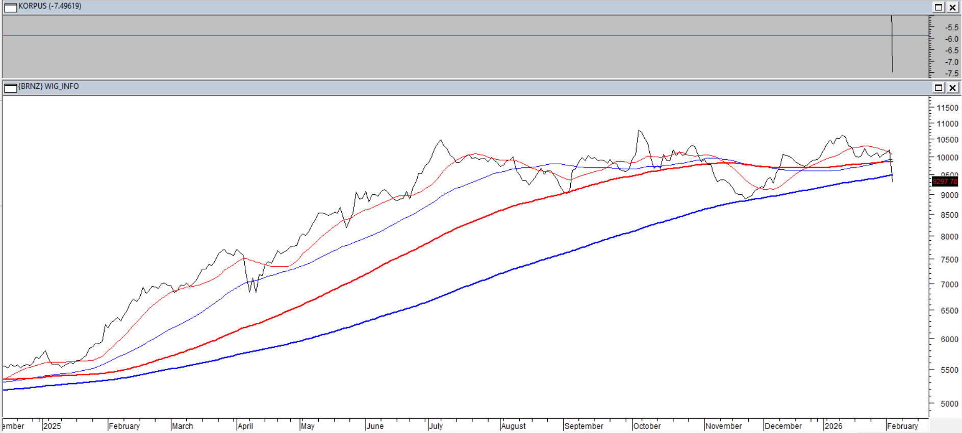 Podczas środowej sesji WIG-INFO zanotował blisko 9% spadek. Uformowany tego dnia korpus jest jednocześnie największym od 2002 roku. Dodatkowo doszło do przebicia dołem średniej 200-sesyjnej, pierwszy raz od około dwóch lat, co technicznie komplikuje sytuację popytową w krótkim i średnim terminie. Kluczowym punktem odniesienia pozostaje wsparcie z listopada. Byki znalazły się tym samym w wyraźnej defensywie, a pokazanie jednoznacznego potwierdzenia siły może odwlec się w czasie.