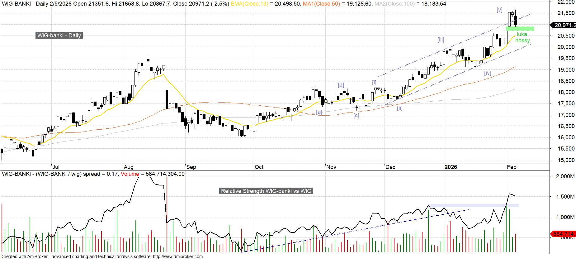 Wraz ze spadkiem z wczorajszej sesji krajowy sektorowy indeks WIG-banki powrócił do wnętrza kanału obejmującego cały 5-falowy impuls wzrostowy budowany od czasu dołka z połowy listopada. Pojawia się więc domniemanie, iż wydłużona fala [v] została zakończona, choć możliwość obrony przed wejściem w korektę daje jeszcze niezamknięta wtorkowa luka hossy 20 700 – 20 888 pkt (z uwagi na wyraźne sygnały zwrotu w dół europejskiego sektora bankowego będzie to jednak dość trudne).