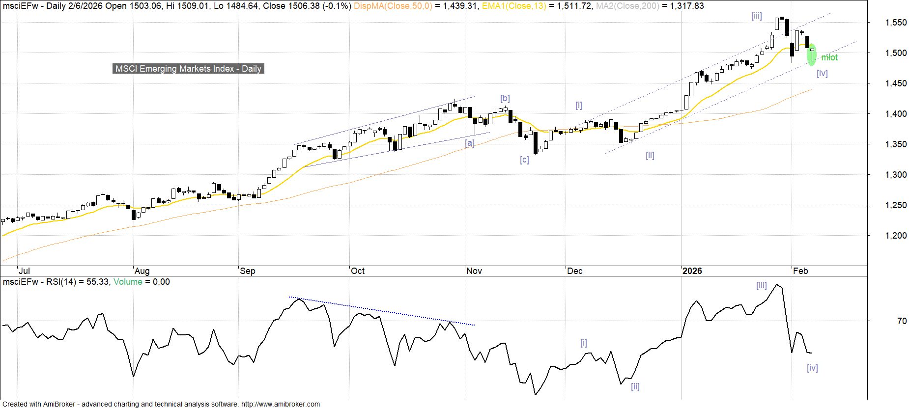 Miniony tydzień upłynął na rynkach wschodzących pod znakiem kontynuacji korekty rozpoczętej szczytem z 29 stycznia, przy czym ostatnia sesja z potencjalnym odwróceniem w postaci świecowej formacji młota sygnalizuje możliwość jej zakończenia w formie płaskiej. Prawdopodobnie stanowiła ona zarazem falę [iv] w potencjalnym 5-falowym impulsie wzrostowym budowanym od 21 listopada (dno ostatniej korekty [a][b][c]), a jej następstwem powinna okazać się zwyżka w ramach końcowej fali [v]. Choć najbardziej typowy scenariusz zakłada w tej sytuacji przekroczenie szczytu z 29 listopada (1 561 pkt), to reguła [v]=[i] dopuszcza także falę załamaną.