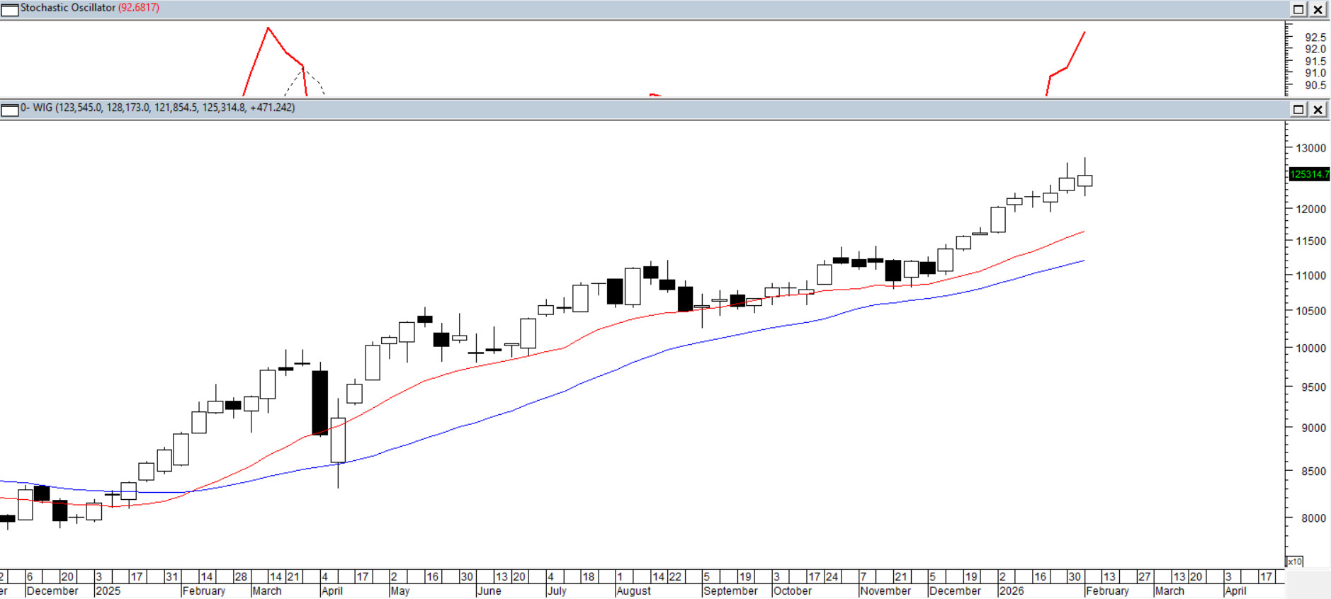 Nie licząc jednego „czarnego” korpusu wielkości 0,02% w połowie stycznia, to kolejny biały, wzrostowy tydzień od początku grudnia ub.roku. Fani wzrostów mogą czuć się niemal w ekstazie. Silny trend potwierdza ułożenie średnich 15/30 oraz fakt, że strefa ta jest niepokonana przez podaż od grudnia 2024 roku. Jednak do radości można, a nawet trzeba dołożyć solidnie już wykupione oscylatory. Poziom powyżej 90 pkt. zazwyczaj wymusza myślenie o potencjalnym ruchu kontrującym, każe być bardziej roztropnym i uwzględniać możliwość oddania inicjatywy podaży bez zmiany trendu, zmiany typowej dla oczekiwanej korekty.
