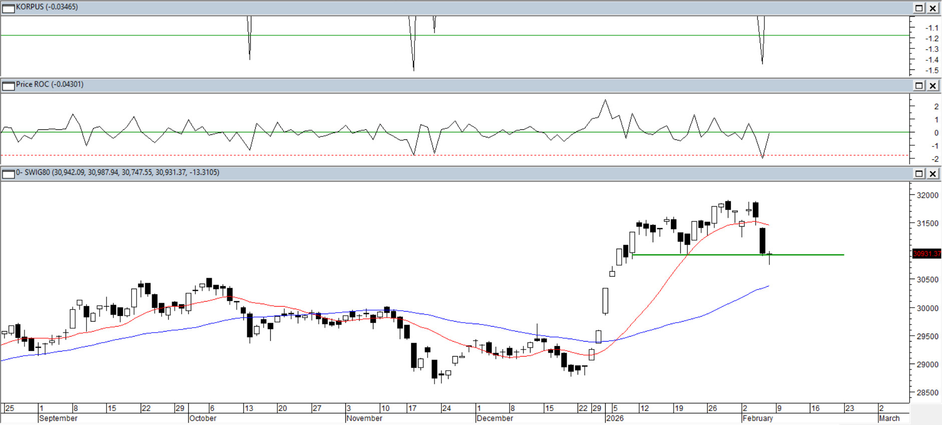 Wielbiciele małych spółek stoją przed dylematem, czy dotychczasowy trend będzie kontynuowany, czy jednak tym razie wzrośnie prawdopodobieństwo pojawienia się korekty. Czwartkowy spadek o ok. 2% był najsilniejszy od czasu kwietniowej przeceny, a na wykresie pojawił się czarny korpus większy niż 1%. W ostatnich miesiącach po takim sygnale rynek rzadko wracał szybko do rytmu trendu, częściej przechodził w fazę schłodzenia. To podbija prawdopodobieństwo korekty i jej wydłużenia w czasie, bez automatycznego łamania trendu. Dodatkowo dość szerokie rozstawienie średnich 15/45 sugeruje, że rynek może potrzebować czasu na powrót do standardowego tempa trendu — podobnie jak poprzednio, gdy korekta rozciągnęła się przed okresem letnim na okres wielu tygodni.