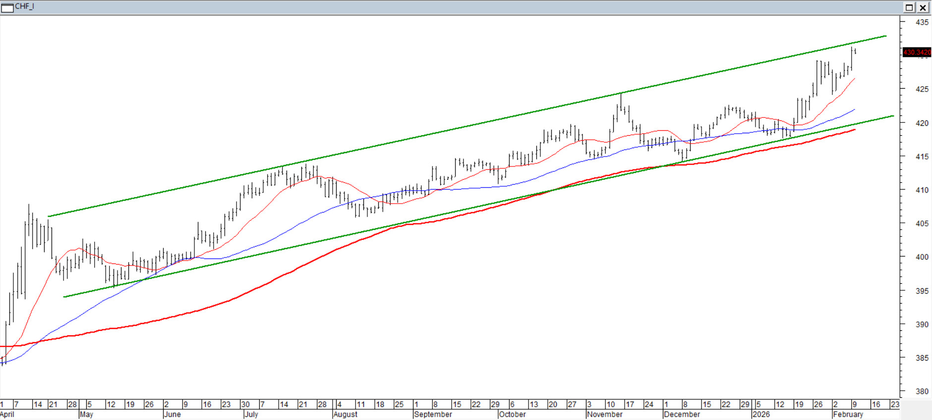 Poniedziałkowy wzrost Franka szwajcarskiego ponad lokalne maksima sprawił, że Frank stał się najsilniejszą walutą w swojej 40-letniej historii notowań. W krótszej (rocznej) perspektywie porusza się w wyraźnym kanale wzrostowym, pozostając powyżej wszystkich kluczowych średnich. Oscylatory szybkie weszły już do strefy wykupienia, sygnalizując możliwość przesilenia i wejścia w korektę, ale trudno tu mówić o zmęczeniu rynku, a jedynie o potrzebie technicznego standardowego skorygowania.