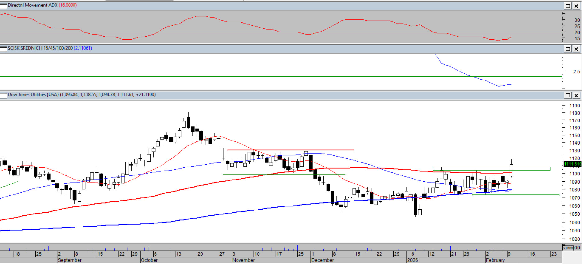 Podczas wtorkowej sesji indeks wybił się ze styczniowej konsolidacji. Sesji towarzyszyło dodatkowo otwarcie Okna Hossy. Wybicie oporu potwierdził lekki wzrost wskaźnika ADX(14), startujący z niskich poziomów, sugerując utrendowienie. Przesłanie z wtorku jest czytelne: byki dostały szansę na kontynuację nowo zainicjowanego impulsu, a cała strefa wsparcia aż do 1073 jest kluczowa. Średnie 15/45/100/200 ścisnęły się do poziomu 2%, najniższego od wakacji. To oznacza gotowość obu stron do wykonania kierunkowego ruchu.