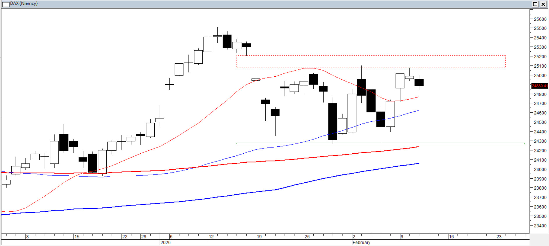 Okno z 19 stycznia pozostaje niezamknięte i kolejny raz działa jako bariera dla popytu, hamując możliwość wygenerowania nowego impetu. Średnie są nadal ułożone poprawnie, a wsparcia od dołu pozostają aktualne. Strefa 24266–24273 wydaje się w oczywisty sposób kluczowa. ADX(14) pozostaje niski, jednocześnie wykazując gotowość do nowego utrendowienia.