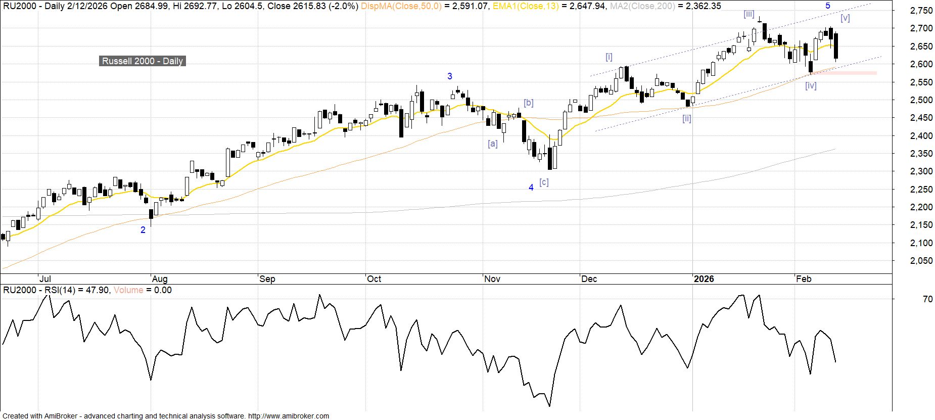 O ile S&P500 od początku roku porusza się w obrębie potencjalnej rozszerzającej formacji wierzchołkowej, to amerykańskim małym spółkom udawało się w tym czasie kontynuować ruch impulsowy rozpoczęty w dnie z 20 listopada (zakończenie ostatniej korekty [a][b][c]). Po mocnym spadku z wczorajszej sesji (-2.0%) fala [v] w tymże impulsie jest jednak bliska załamania, a sygnałem przejścia do większej korekty byłby w tym przypadku spadek poniżej ubiegłotygodniowego minimum 2 569 pkt (dno fali [iv]).