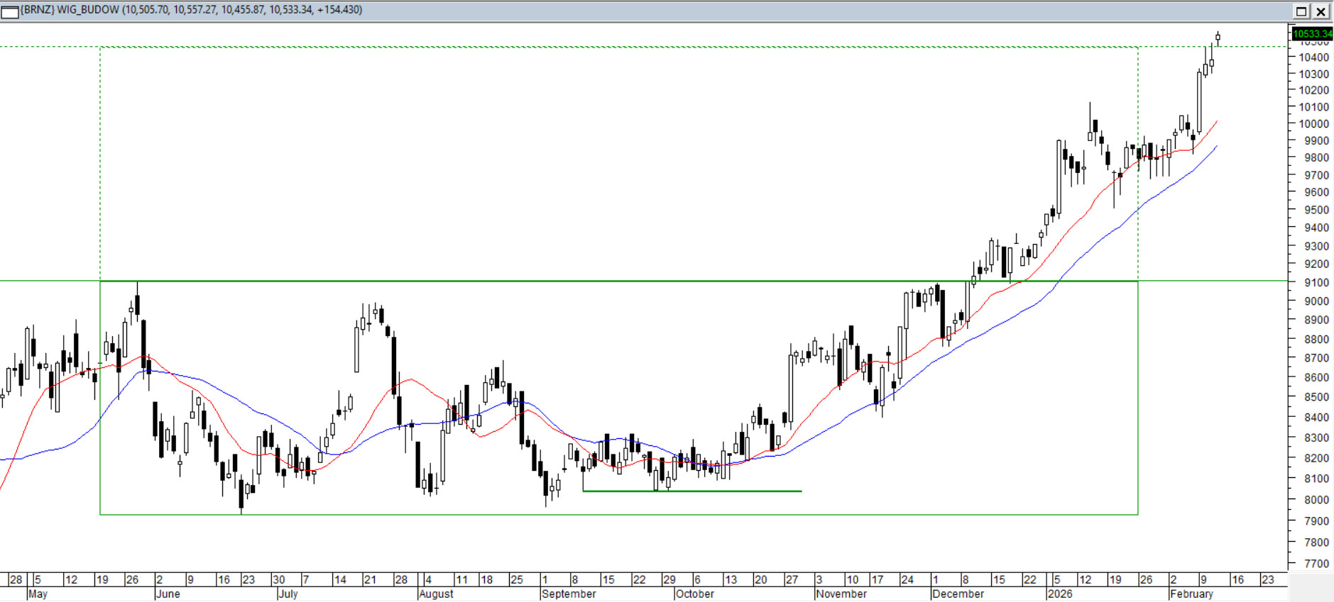 Popularna budowlanka znalazła się na swoich rekordowych poziomach. Poprzednie półrocze kurs spędził w szerokiej konsolidacji w formie prostokąta, z której wybicie przyniosło ruch o pełnej wysokości tej formacji. Średnie 15/45 prowadzą trend w sposób modelowy, potwierdzając siłę popytu. Oscylatory weszły w strefę wykupienia. W takiej konfiguracji pojawienie się korekty będzie naturalnym elementem trwającego trendu i nie powinno być dla nikogo zaskoczeniem.