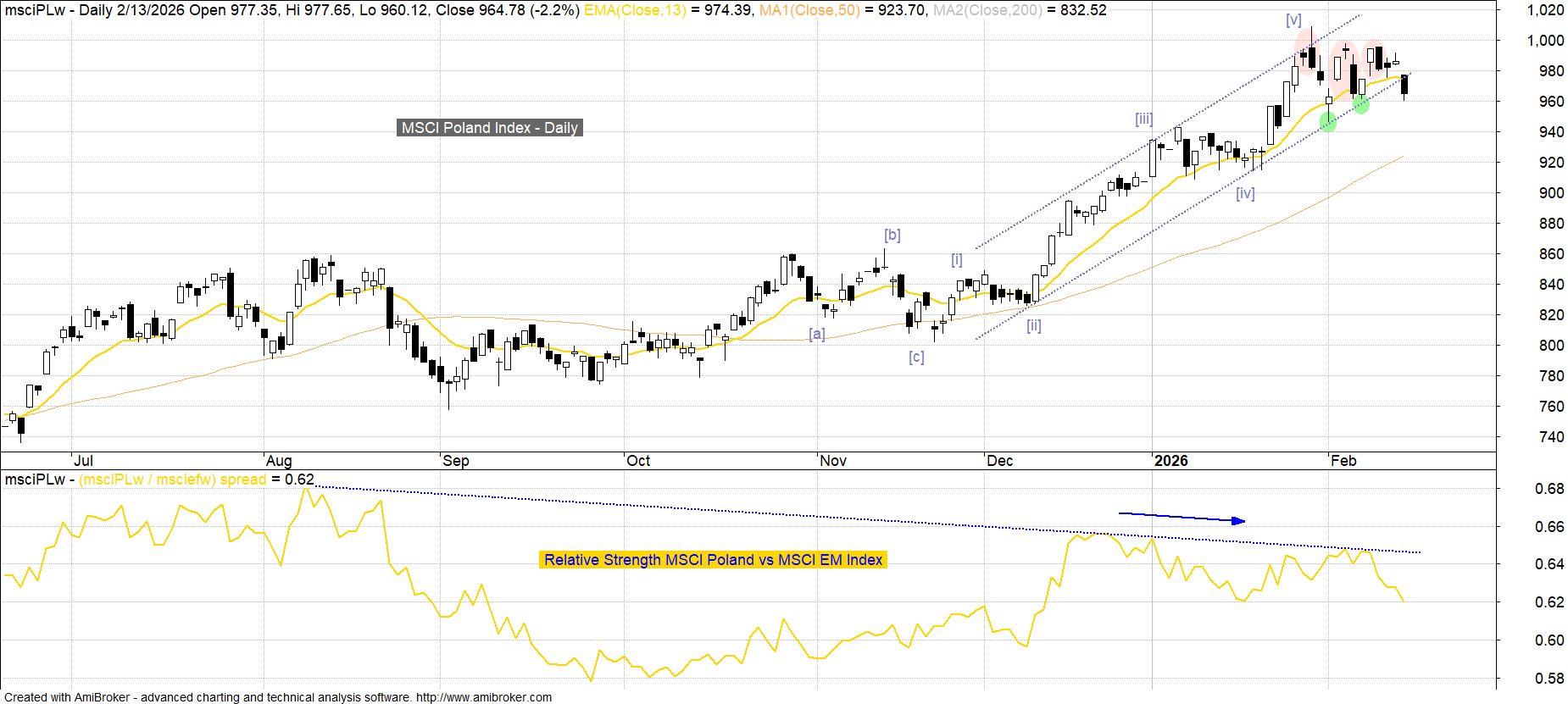 Kluczowy z punktu widzenia inwestorów zagranicznych indeks MSCI Poland końcem stycznia dotarł do górnego ograniczenia kanału obejmującego cały 5-falowy impuls wzrostowy budowany po dnie z 21 listopada (dno ostatniej korekty [a][b][c]), sygnalizując możliwość jego zakończenia. Od tego czasu trzykrotnie na osiągniętym wówczas pułapie cenowym budowane były świecowe formacje odwrócenia (kolejno objęcie bessy, gwiazda wieczorna i ponownie objęcie bessy), z tym, że obronę przed wejściem w większą korektę zapewniała rosnąca średnia EMA(13) w połączeniu z dolnym ograniczeniem wspomnianego na wstępie kanału. Po słabym przebiegu sesji piątkowej (czarny korpus + luka bessy 978-984 pkt) opisany wcześniej układ obronny został przełamany.