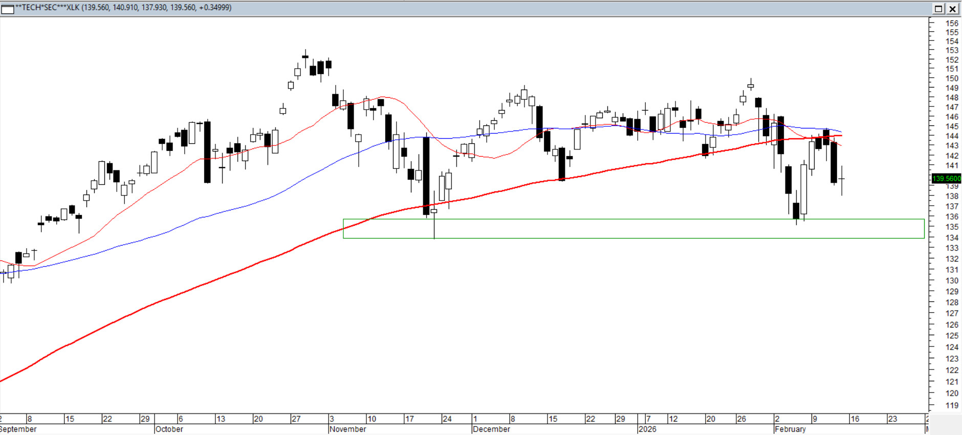Kurs najważniejszego ETFa reprezentującego amerykański sektor technologiczny utknął. Od jesieni porusza się w obrębie kilkutygodniowej strefy ekstremów, a w lutym doszło do zejścia poniżej średnich 15/45/100. Rosnący ADX(14) potwierdzał próbę utrendowienia ruchu w kierunku spadkowym. W bieżących notowaniach utrzymuje się wciąż przewaga podaży. Kurs pozostaje jednak powyżej jesienno-zimowych minimów, które wyznaczają kluczową strefę obrony popytu.