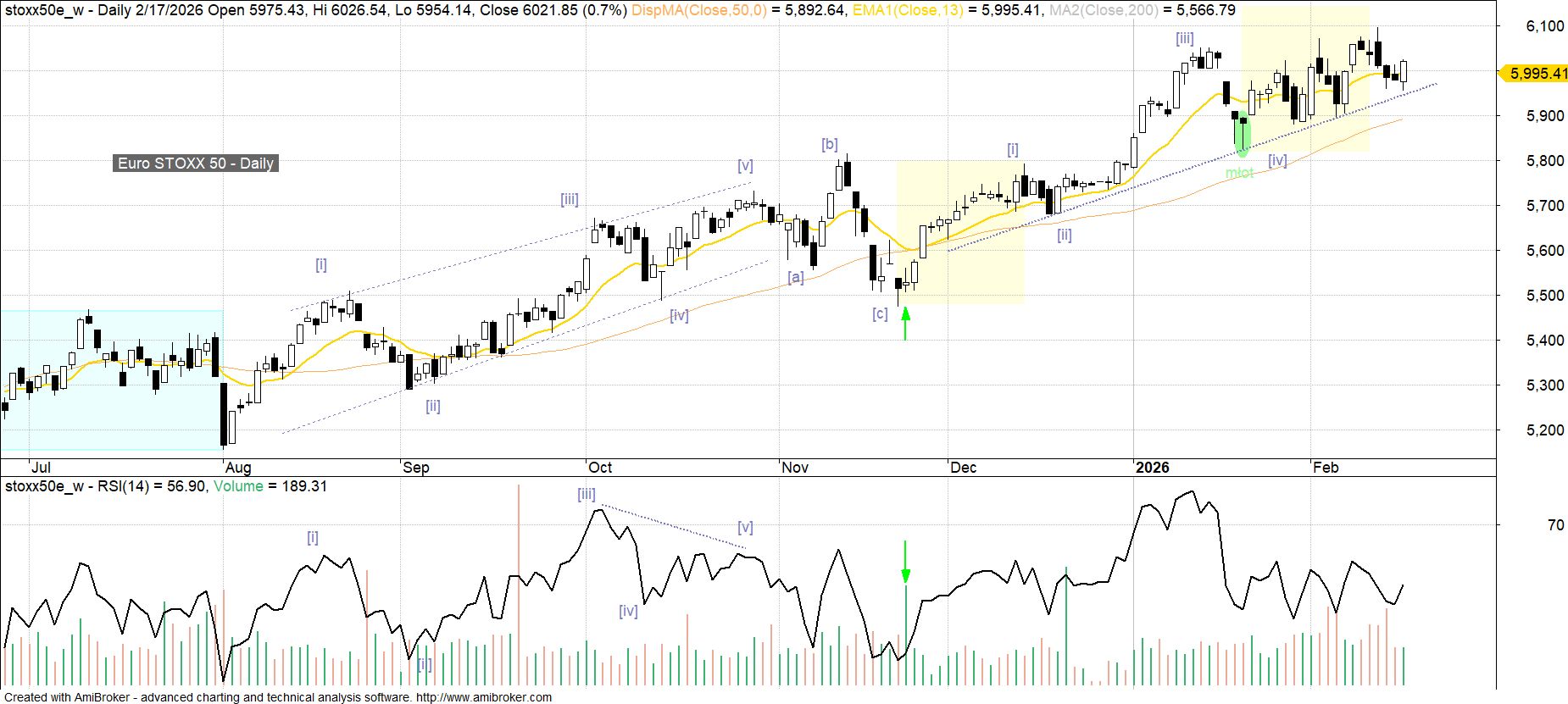 O ile w przypadku S&P500 od końca grudnia można mówić o budowie potencjalnej formacji wierzchołkowej, to indeks 50-ciu blue-chipów strefy euro w tej samej perspektywie czasowej kontynuuje zwyżkę w ramach 5-falowego impulsu zapoczątkowanego w dnie z 21 listopada (zakończenie ostatniej korekty [a][b][c]). Podstawowy zasięg dla fali [v] wynikający z porównania z falą [i] (6 140 pkt) nie został jeszcze zrealizowany, a będzie to nadal możliwe o ile bronić się będzie dolne ograniczenie kanału obejmującego cały wspomniany wcześniej impuls (obecnie ok. 5 955 pkt).