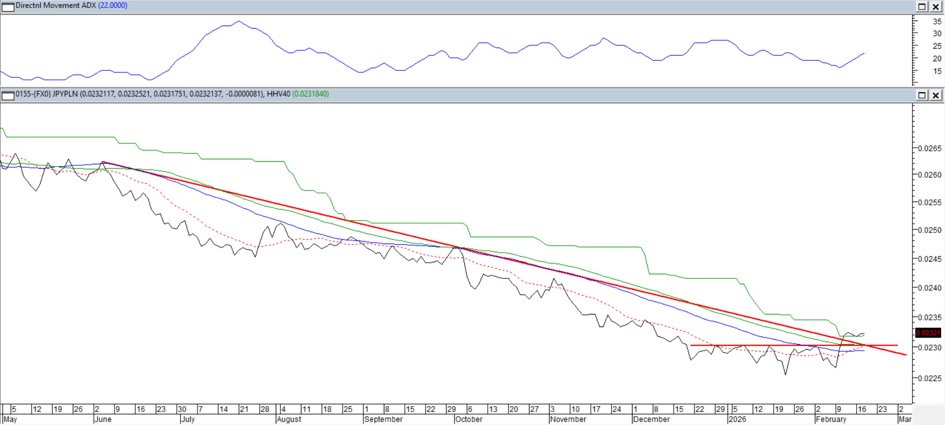 W ostatnich tygodniach na wykresie można dostrzec umacnianie japońskiego Jena: doszło bowiem do sforsowania ponad półrocznej linii trendu spadkowego. Dodatkowo rynek pokonał maksima z ostatnich 40 sesji. Taki układ sprzyja próbie odwrócenia korzystnej dla złotego tendencji albo sygnalizuje korektę większego rzędu. ADX(14) nieśmiało podnosi się z niskich poziomów, co potwierdza gotowość do ponownego utrendowienia ruchu. Średnie 15/45/60 zostały przebite w górę, co wzmacnia wymowę sygnału i tworzy bazę pod potencjalną kontynuację.