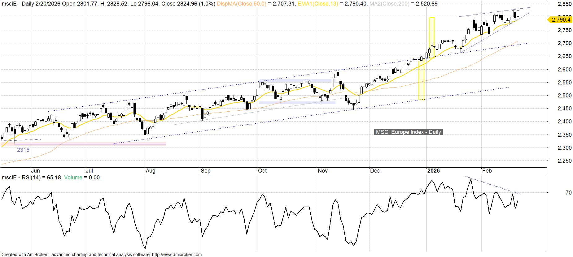 Skupiający 15 europejskich rynków rozwiniętych indeks MSCI Europe końcem stycznia zrealizował potencjał wzrostowy odpowiadający szerokości opuszczonego kanału z drugiego półrocza (ok. 2 800 pkt). Od tego czasu udaje się wprawdzie jeszcze wyznaczać nowe tegoroczne maksima, ale zwyżka jest kontynuowana w schyłkowej formie klina. W tym układzie do sugerującego przejście do większej korekty wybicia dołem doszłoby w przypadku nieutrzymania ubiegłotygodniowego minimum 2 774 pkt.