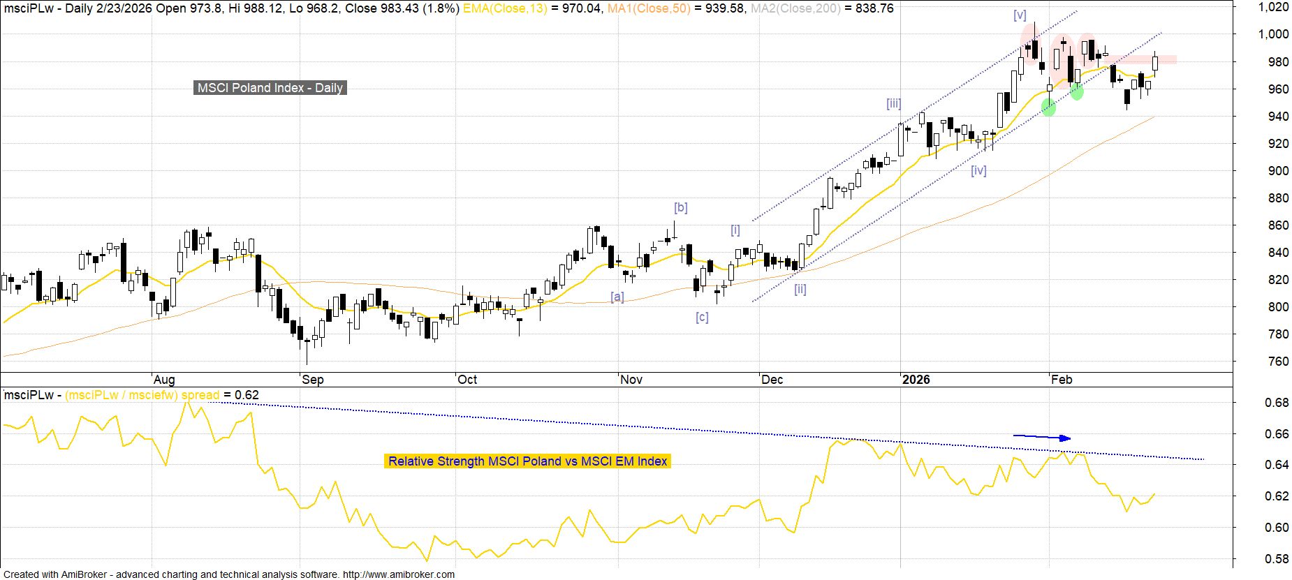 Kluczowy z punktu widzenia inwestorów zagranicznych indeks MSCI Poland zdołał wczoraj zamknąć lukę bessy 978-984 pkt z ubiegłego piątku, odmiennie niż WIG20 pozostając jednak poniżej lokalnego szczytu z 10 lutego. Choć w tej sytuacji na krótką metę można mówić o neutralizacji układu sprzyjającego wejściu w większą korektę, to z uwagi na problematyczną sytuację średnioterminową (m.in. ponowienie relatywnej słabości po wypełnieniu struktury impulsu wzrostowego budowanego od 21 listopada) wydaje się, iż to rozstrzygnięcie będzie miało charakter tymczasowy.