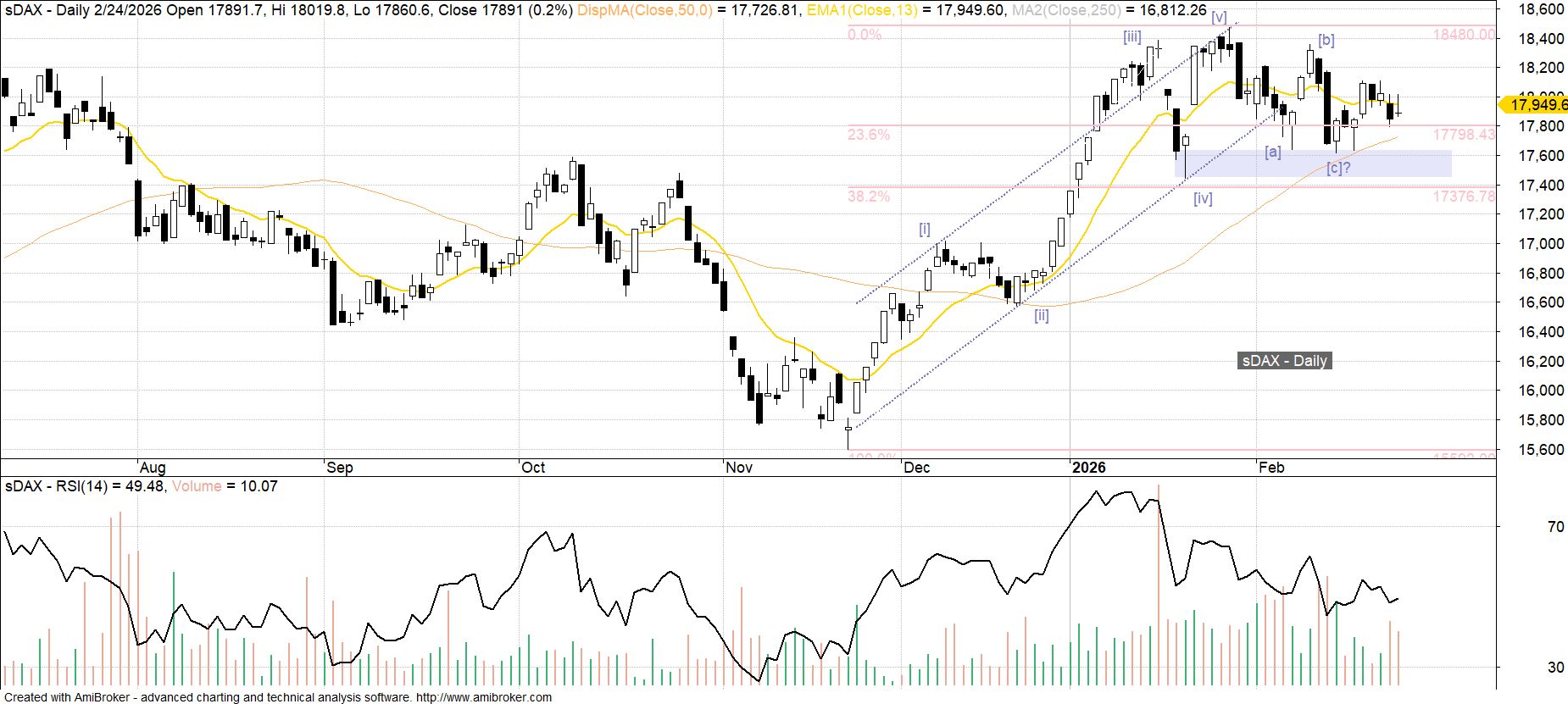 Korekta, jaka na rynku niemieckich małych spółek pojawiła się po tegorocznym szczycie z końca stycznia przyjmuje postać klasycznego zygzaka [a][b][c] celującego rejon dna fali [iv] i przedział 23.6%-38.2% zniesienia wcześniejszego 5-falowego impulsu wzrostowego, co w ostatnim czasie w nieco mniej regularnej formie próbuje kopiować także sWIG80. Poza koniecznością dalszej obrony pułapu 17.4-17.6 tys. pkt, dla zwiększenia szans na zamknięcie korekty w tym kształcie wskazane byłoby wyjście ponad górny zakres wysokiego czarnego korpusu z 12 lutego (18.2 tys. pkt).