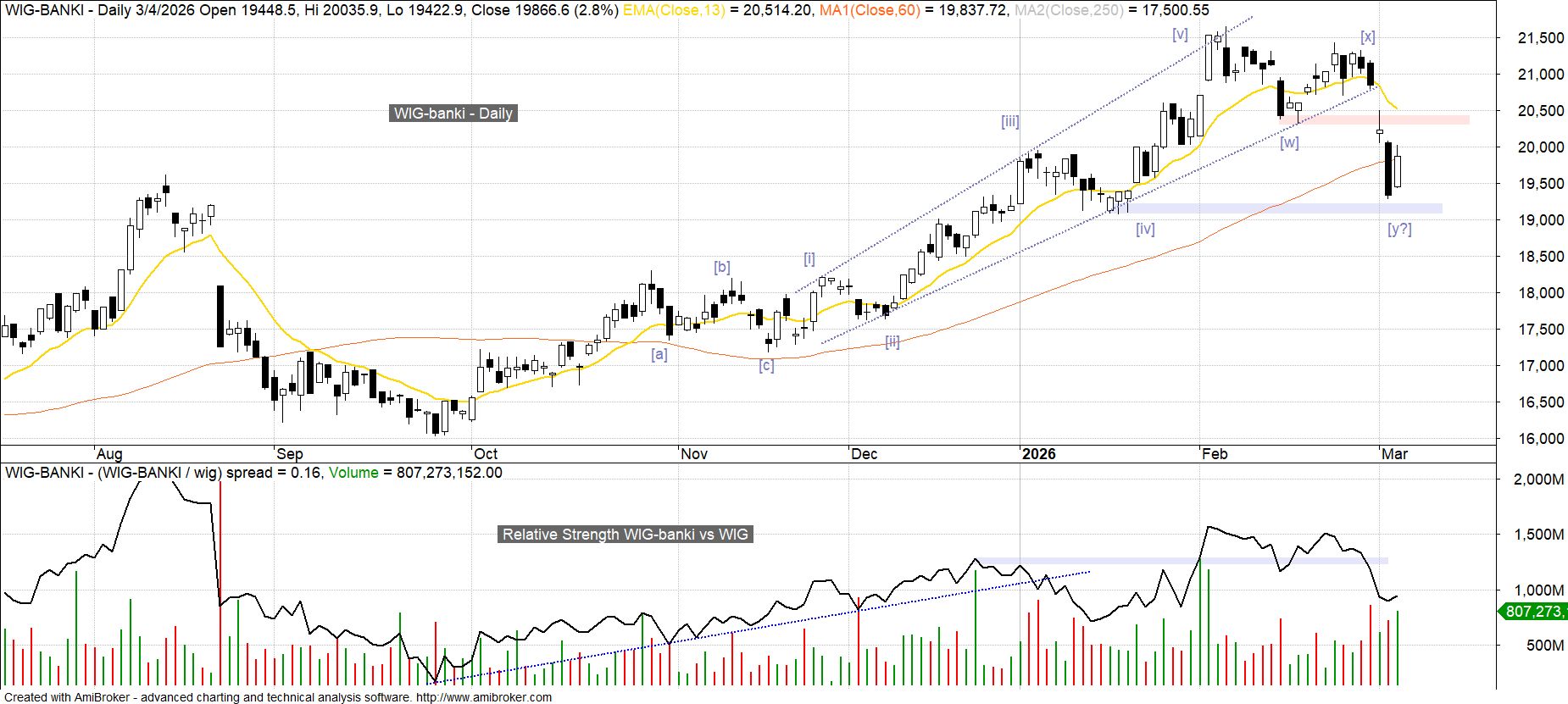 Budowana przez indeks europejskiego sektora bankowego miesięczna struktura korekcyjna [w][x][y] jest widoczna także na krajowym indeksie WIG-banki. Niekorzystną różnicą jest w tym przypadku wyraźne wydłużenie fali [y] wobec [x], co przy ocenie szans na zakończenie korekty zwraca szczególną uwagę na konieczność wyjścia ponad dno fali [w] (20.4 tys. pkt).