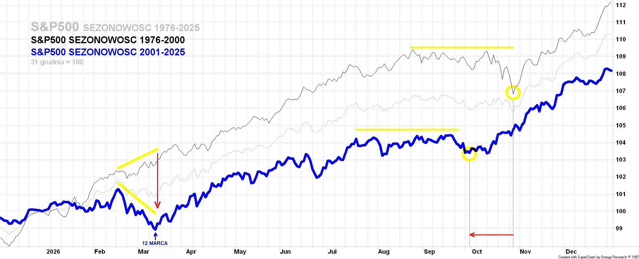Porównując wykresy sezonowe S&P500 dla ostatnich 25-ciu lat XX wieku i pierwszych 25-ciu lat wieku obecnego (odpowiednio okresy 1975-2000 oraz 2001-2025) dostrzegalna jest pewna ewolucja tendencji przypisywanych porom roku. Przede wszystkim zwyczajowy okres pomajowej słabości ("Sell in May and go away"), na wykresach widoczny jako kilkumiesięczny horyzontalny przerywnik w dominującym na przestrzeni całego roku trendzie wzrostowym zaznacza się obecnie nieco wcześniej, podobnie z wyprzedzeniem dochodzi do uformowania sezonowego jesiennego dołka. Kolejną, znacznie istotniejszą z bieżącej perspektywy różnicą jest kilkutygodniowe wyraźne cofnięcie jakie pojawia się na przełomie lutego i marca, co we wcześniejszym ćwierćwieczu było zupełnie niewidoczne.