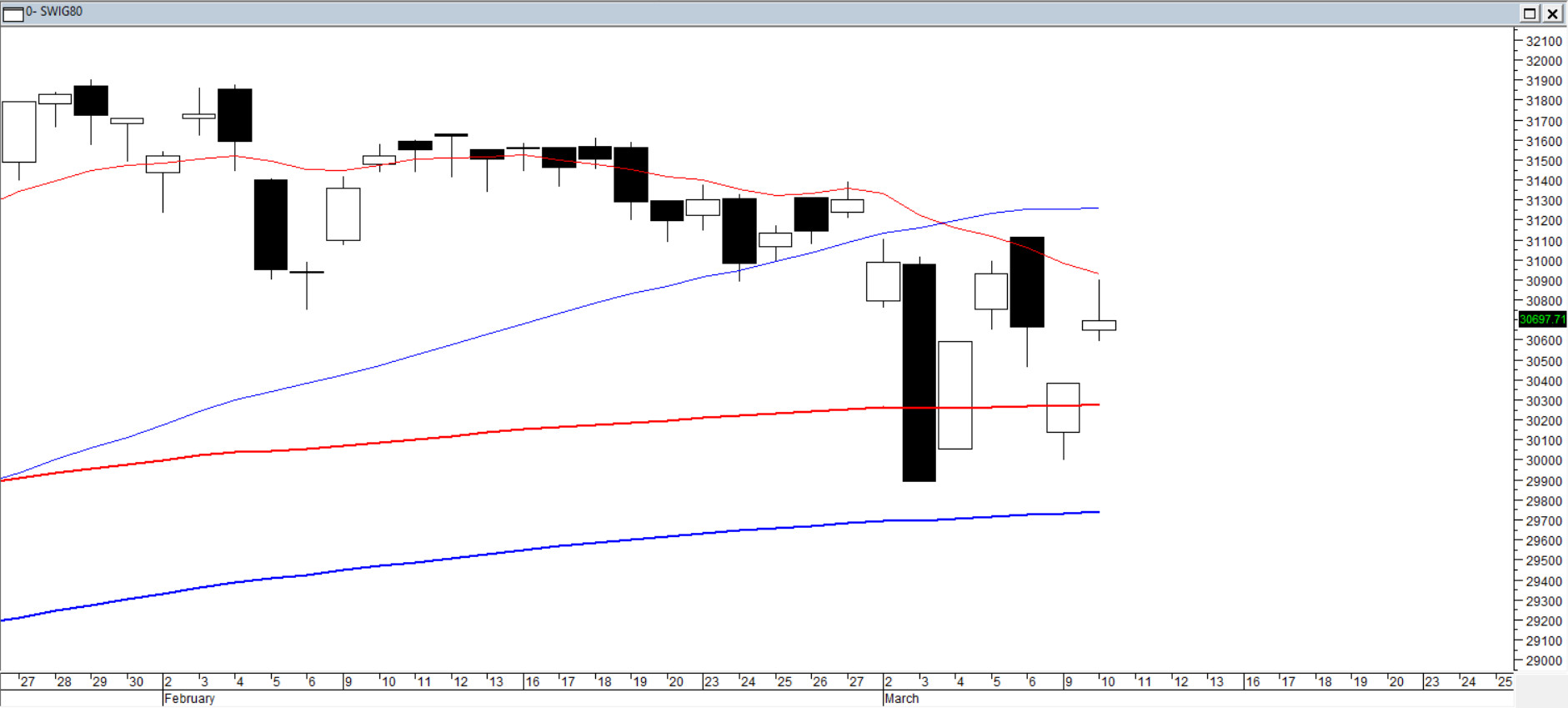 Indeks małych spółek konsoliduje w strefie średnich 15/45/100/200, a towarzyszy temu wyraźnie podniesiona zmienność. Rynek wysyła naprzemiennie sprzeczne sygnały: duży czarny korpus spadkowy, chwilę później harami wzrostowe, następnie objęcie bessy i okno bessy, by zaraz pojawiło się okno hossy. Taka sekwencja świec łatwo wprowadza chaos interpretacyjny. W tej sytuacji najbardziej racjonalną decyzją wydaje się przeczekanie. Dopiero spadek zmienności i uspokojenie struktury rynku stworzą warunki do bardziej jednoznacznej oceny. Ewentualnie opuszczenie pasma wspomnianych średnich.