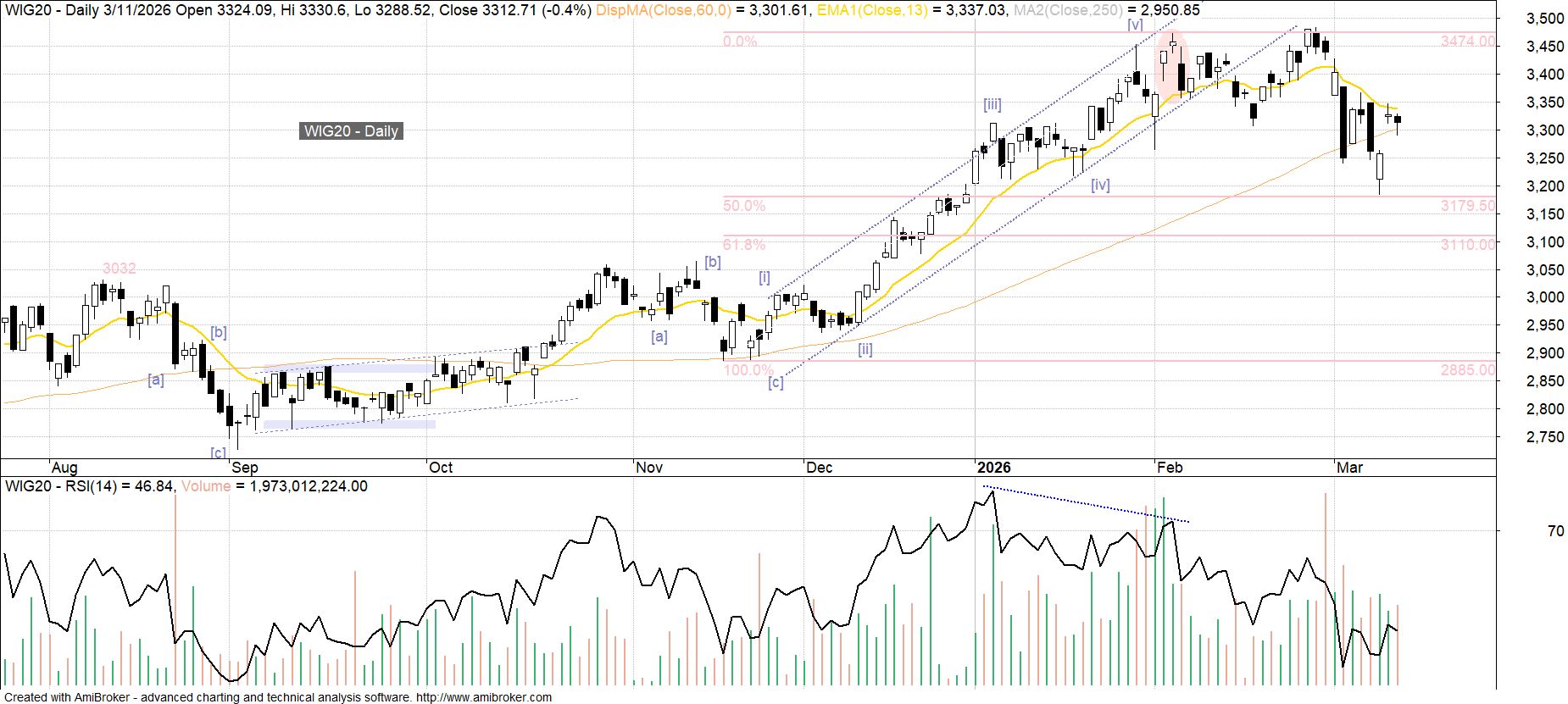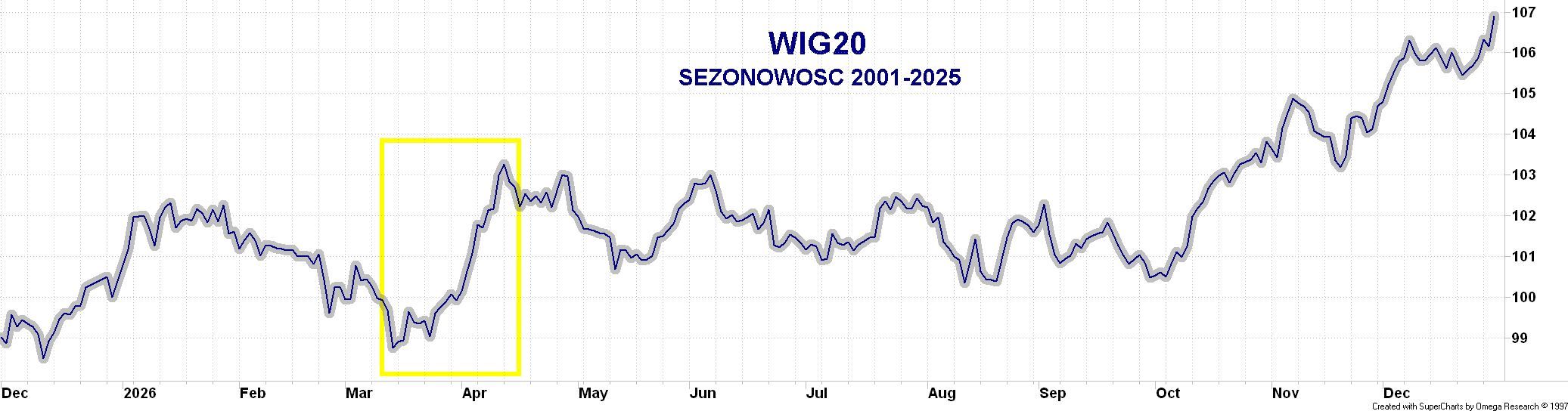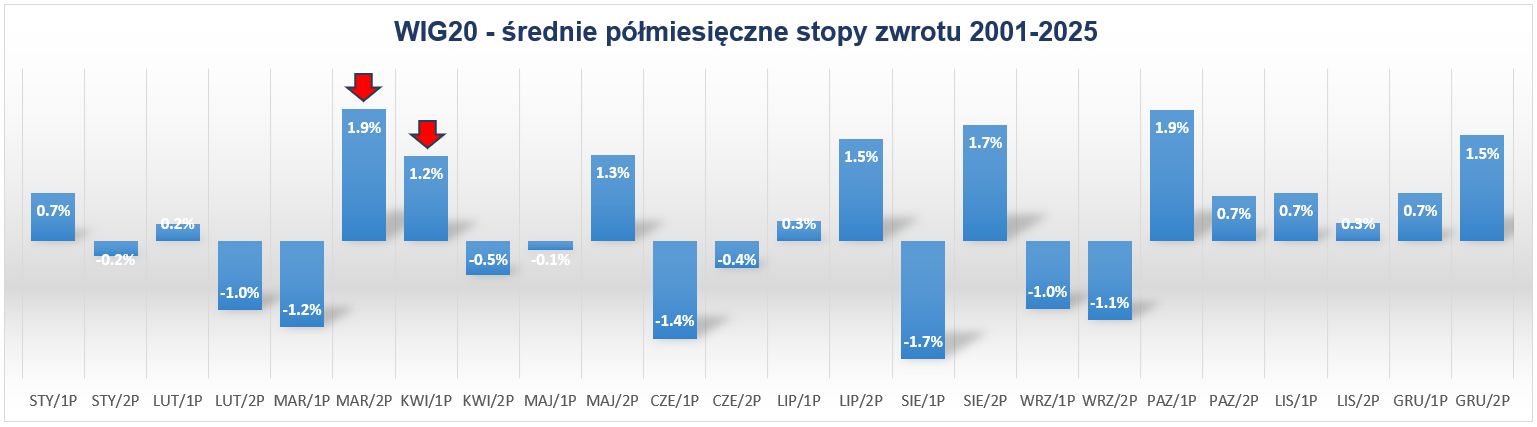 W ramach płaskiej korekty nieregularnej jaka ma miejsce po zakończeniu 5-falowego impulsu wzrostowego budowanego od czasu dna z 21 listopada, WIG20 na pierwszej sesji bieżącego tygodnia dotarł do pułapu 50-procentowego zniesienia wcześniejszej zwyżki (3 180 pkt). W przypadku korekty o typowym charakterze tak głębokie zniesienie dawałoby szansę na niedaleką próbę obrony, co obecnie wydaje się jednak mocno uzależnione od zachowania rynków bazowych (na utrzymanie zniesienia 61.8% szansę ma nadal MSCI Emerging Markets Index, bardziej problematyczna jest sytuacja rynków europejskich). W tym kontekście na razie na dalszy plan wydają się schodzić uwarunkowania sezonowe, gdzie zbliżająca się druga połowa marca wraz z pierwszą połową kwietnia tworzą najbardziej byczą parę sąsiadujących z sobą półmiesięcznych okresów na przestrzeni całego roku.