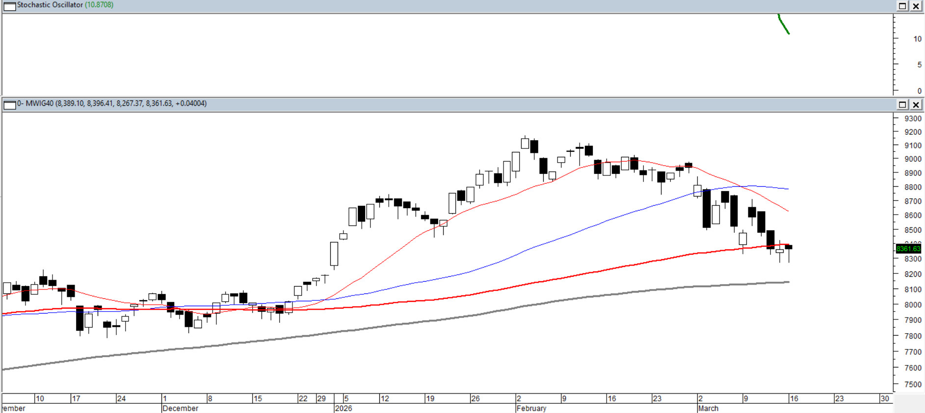 Dolne cienie z piątku i poniedziałku sugerują lekkie wyczerpywanie się presji spadkowej. Cała sekwencja odbywa się jednak pod zestawem średnich 15/45/100, co utrzymuje techniczną przewagę podaży. W pobliżu przebiega średnia 200-sesyjna, która może w najbliższych dniach pełnić rolę ruchomego wsparcia. Szybkie oscylatory zaczynają sygnalizować stan wyprzedania. W takim układzie rynek może spróbować krótkiego odreagowania, co na chwilę oddali obawy o kontynuację spadków.