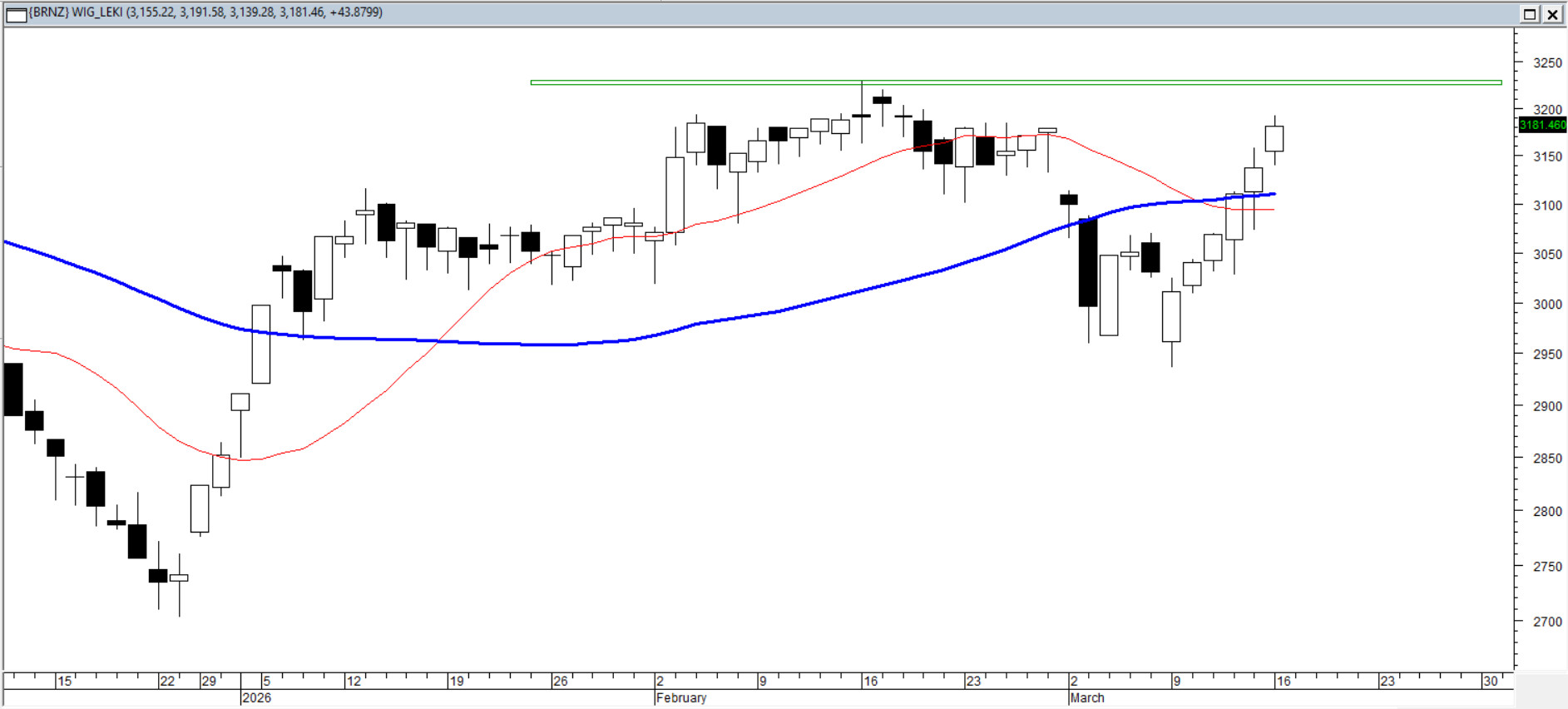 Kurs odnotował sześć kolejnych białych korpusów, co oznacza wyraźne przyspieszenie popytu. W trakcie ostatnich sesji doszło do domknięcia „wojennego” okna bessy, a notowania wróciły powyżej średnich 15 i 45 sesji. Tym samym indeks znalazł się w bezpośredniej bliskości lutowych maksimów. Siła ostatniego odbicia sugeruje, że popyt nie tylko odzyskał równowagę, ale próbuje przejąć inicjatywę. Teraz rynek staje przed testem tegorocznych szczytów – ich pokonanie otworzyłoby drogę do kontynuacji ruchu wzrostowego.