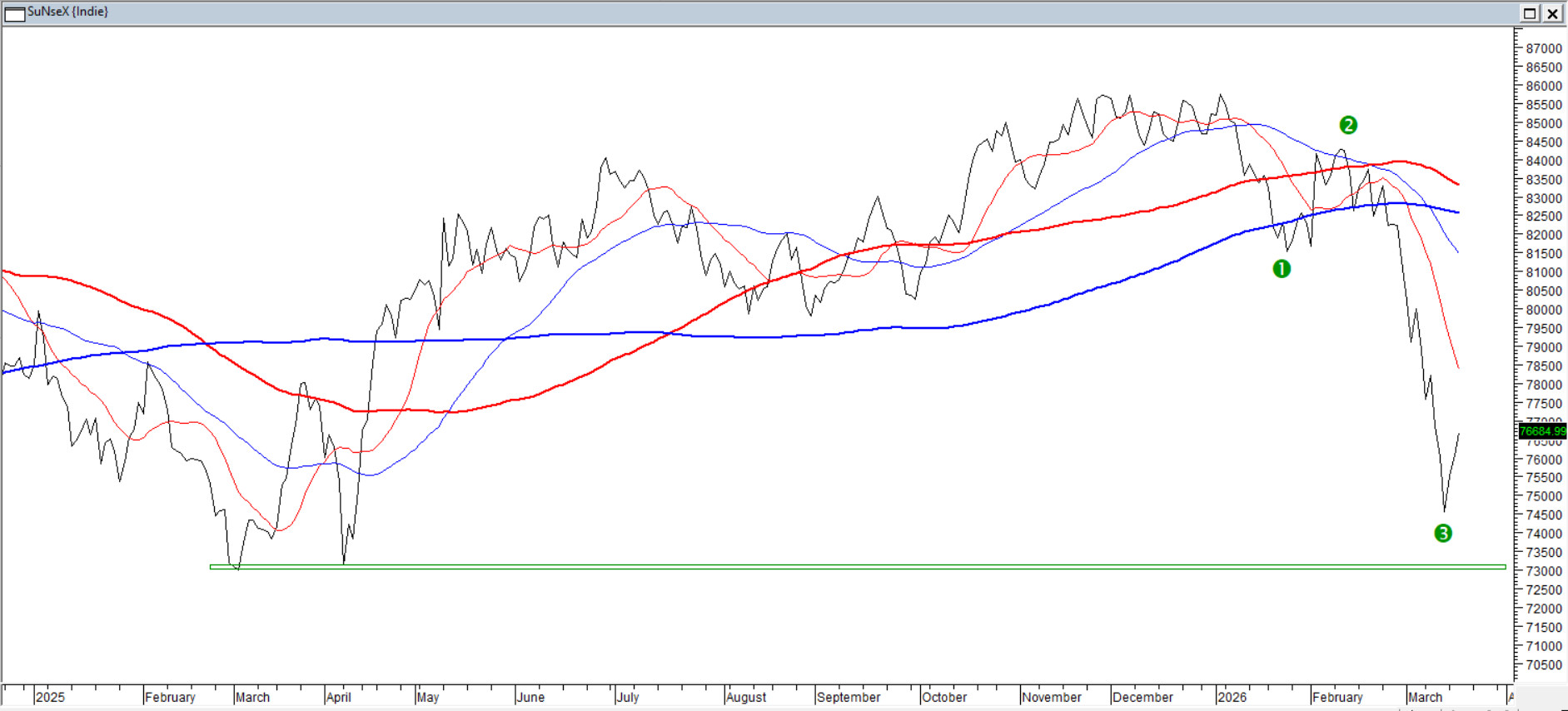 Indyjskie byki znajdują się w głębokiej defensywie. Ostatnia fala spadkowa jest już wyraźnie wydłużona, co sprzyja interpretacji jej jako elliottowskiej fali trzeciej. Odbicie z ostatnich sesji wpisuje się zatem w korekcyjną czwórkę, a nie zmianę układu. Roczne minima z poprzedniej zimy są coraz bliżej i zaczynają działać jak naturalny magnes dla obecnej ceny. Średnie kroczące pozostają ułożone książkowo dla rozwiniętego trendu spadkowego – krótkie poniżej długich i wszystkie skierowane w dół. W takiej strukturze bazowym scenariuszem pozostaje kontynuacja ruchu w dół po wyczerpaniu obecnej korekty.