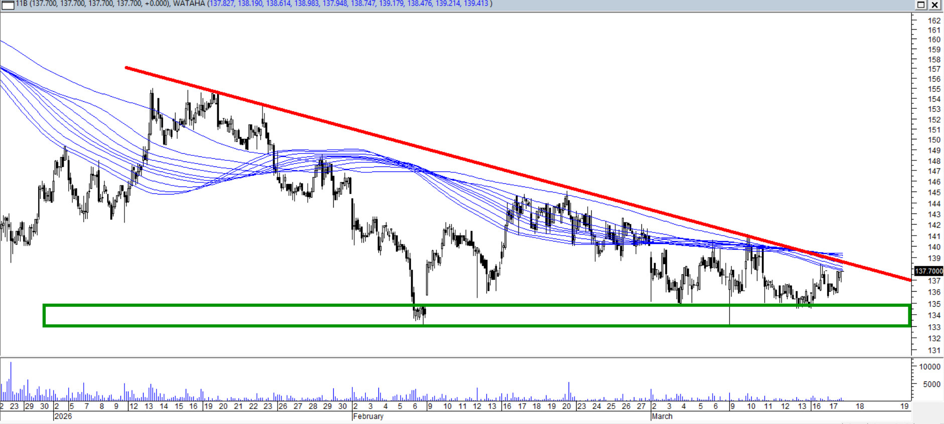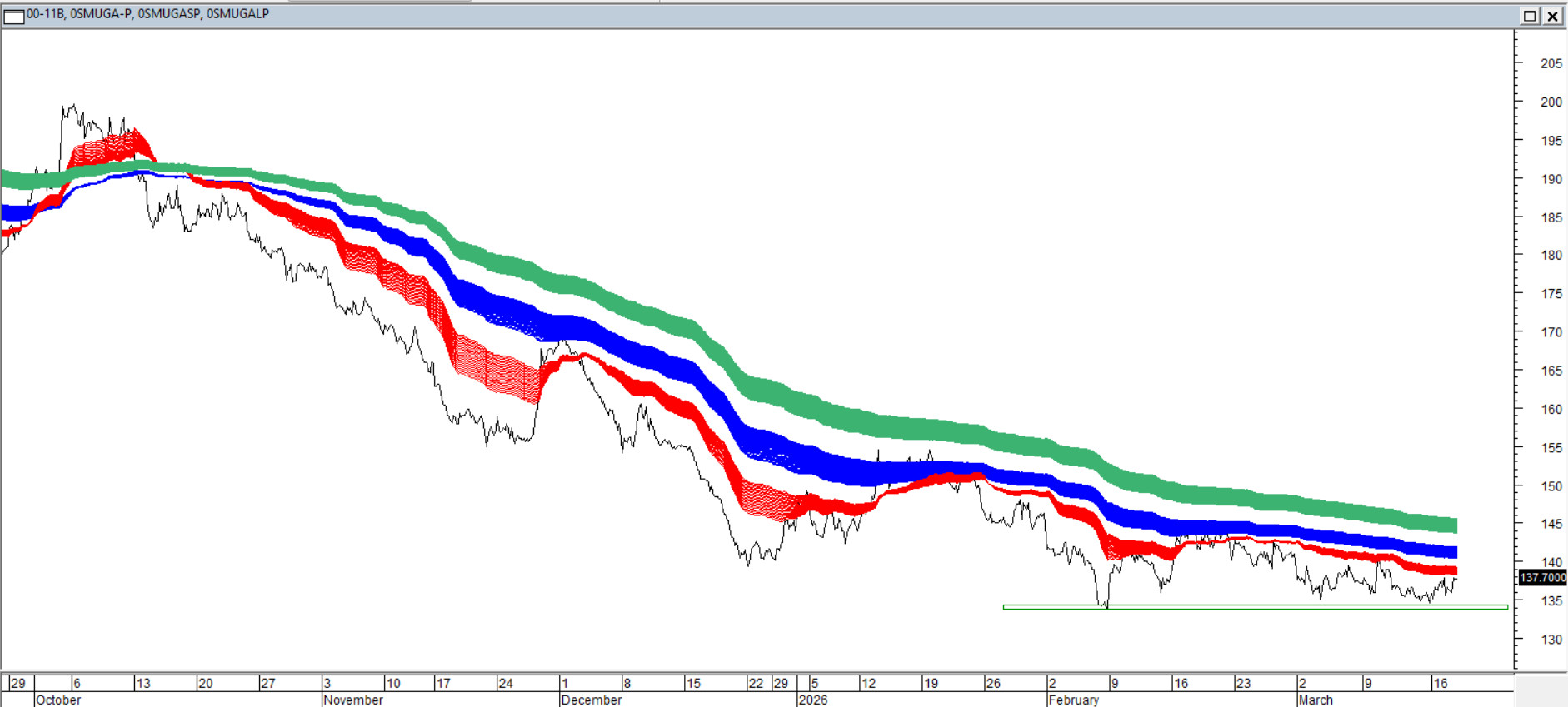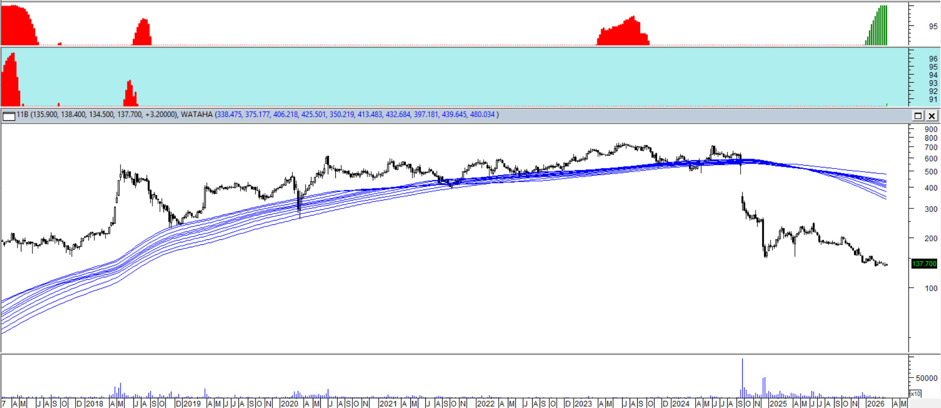 To jeden z bardziej rozpoznawalnych polskich deweloperów gier, twórca Frostpunka i This War of Mine. Na wykresie godzinowym obraz pozostaje jednoznaczny — od października kurs porusza się w rozwiniętym trendzie spadkowym. Średnie kroczące przez cały ten okres pozostają ułożone niedźwiedzio: krótkie średnie poruszają się klasycznie poniżej długich, na dodatek z wyraźnym kierunkiem w dół. Każda próba odreagowania kończyła się odrzuceniem od strefy średnich, które pełnią rolę ruchomego oporu. Od lutego kurs wszedł w fazę konsolidacji tuż nad wsparciem w strefie 133-135 zł i tam pozostaje do dziś. To w tej chwili jedyny realny punkt zaczepienia dla wyraźnie osłabionego popytu, coś w rodzaju ostatniego bastionu byków. Jednocześnie właśnie od lutego popyt buduje tam wyraźną bazę pod potencjalne korygujące wzrosty, więc technicznie ten fragment wykresu zaczyna wyglądać interesująco. Utrata tej strefy otworzy przestrzeń do dalszego osuwania bez wyraźnego technicznego oparcia, a dopóki średnie pozostają ułożone w obecny sposób, scenariusz wzrostowy wymaga najpierw odzyskania choć części strefy oporu — i do tego droga może być nadal daleka i żmudna. Oscylatory tygodniowe na poziomach niezwykle silnego wyprzedania.