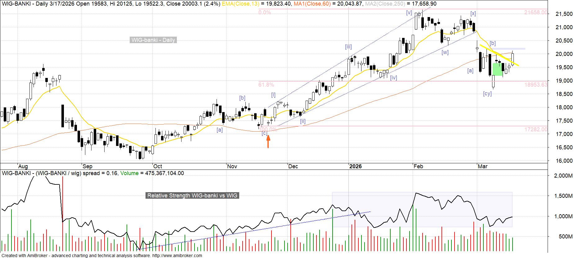Sektorowy indeks WIG-banki początkiem lutego wszedł w fazę korekty, która licząc do marcowego minimum z ubiegłego poniedziałku przybiera postać podwójnego zygzaka [w][x][y] celującego w rejon 61.8-procentowego zniesienia Fibo wcześniejszego 5-falowego impulsu wzrostowego. Analogiczna korekcyjna struktura, choć z nieco głębszym zniesieniem, jeszcze do połowy bieżącego tygodnia widoczna była w przypadku europejskiego sektora bankowego reprezentowanego przez STOXX Europe 600 Banks (krajowe składowe to PKO BP i Pekao), jednak wczorajsze zejście na nowe marcowe minimum należałoby uznać za sygnał jej dalszego rozwinięcia. Na tym tle relatywna siła polskich banków jest w ostatnich dniach ewidentna, przy czym skala tego wyróżnienia może wręcz zaskakiwać. Strona popytowa nadal dysponuje tu nie tylko wspierającym działaniem luki hossy z ubiegłego wtorku (19.2-19.6 tys. pkt), ale także niezanegowanym wybiciem ponad linię sygnalną 2-tygodniowej pochylonej formacji oRGR (obecnie ok. 19.5 tys. pkt).