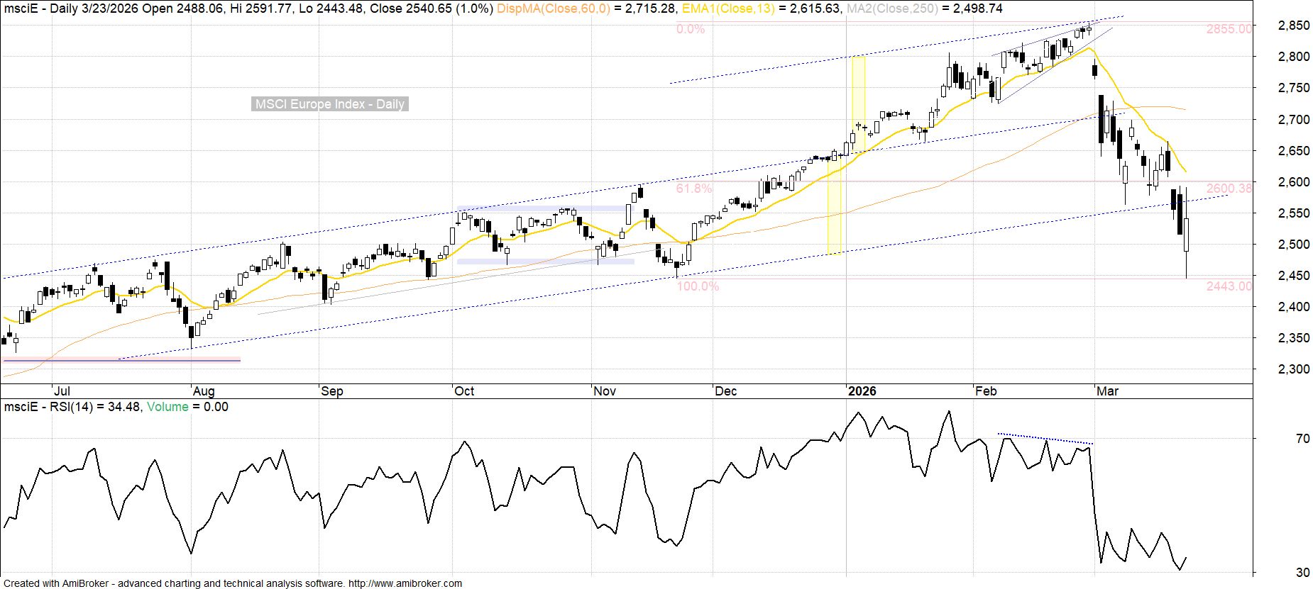 Skupiający 15 europejskich rynków rozwiniętych indeks MSCI Europe w pierwszej fazie poniedziałkowej sesji spadł do pułapu dołka z 21 listopada ub.r. (2 442 pkt), co oznacza, że zniesienie widocznej na wszystkich rynkach bazowych późniejszej fali zwyżki sięgnęło 100%. W tym kontekście za wczorajszym południowym zwrotem akcji, mimo że zupełnie niespodziewanym, stoi pewne prawdopodobieństwo udanej próby wyznaczenia twardego dna, choć na obecnym etapie (m.in. przy niedźwiedzim układzie średnich kroczących 13/60) droga do tego jest daleka.