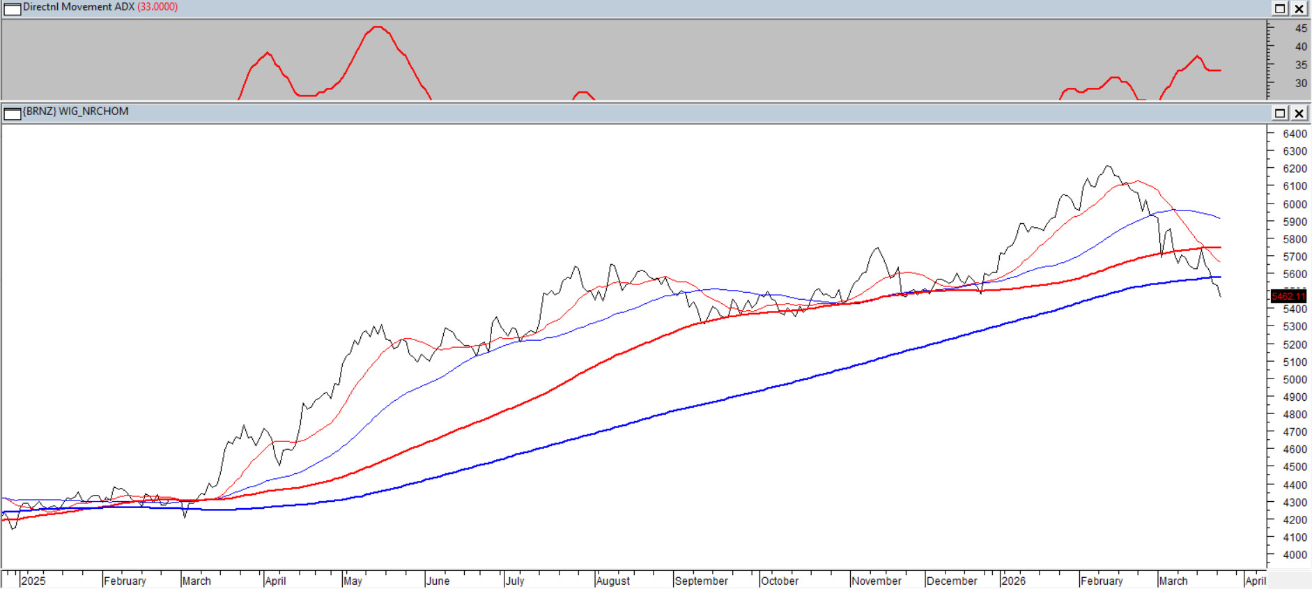 Indeks spółek deweloperskich po roku hossy wchodzi w poważne turbulencje. Średnia 15-sesyjna po raz pierwszy od roku zepchnęła kurs poniżej średniej 200-sesyjnej — to wyraźny sygnał zmiany układu sił. Podaż przyciska, trend spadkowy nabiera kształtu, a ADX(14) będąc na poziomie 33 pkt. potwierdza istnienie trendu. Długoterminowe średnie 100 i 200 wciąż rosną, co może oznaczać ograniczać zasięg ewentualnej przeceny — ale póki kurs porusza się pod sekwencją średnich 100/200 pozostając standardowo w królestwie niedźwiedzia.