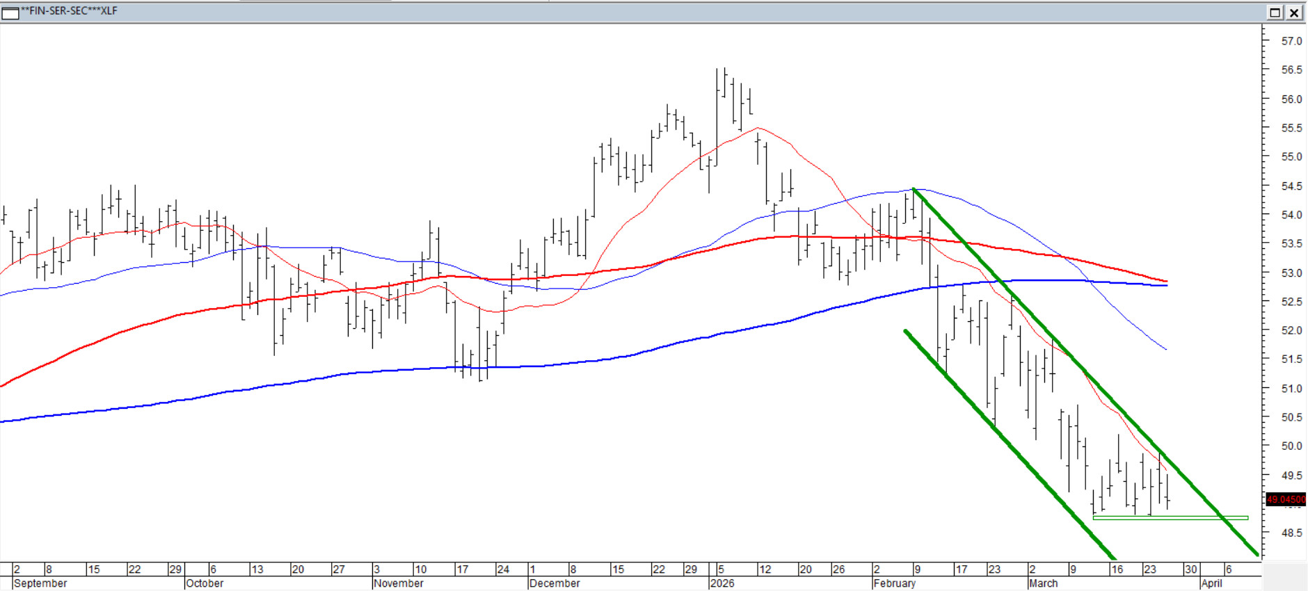 Od początku lutego kurs największego ETF-a amerykańskiego sektora finansowego porusza się w czytelnym kanale spadkowym. Kurs znalazł się wyraźnie poniżej sekwencji średnich kroczących z 45/100/200 sesji, które z prowadzących trend pomocników zimą zmieniły się w aktywny opór. Średnie 45/100 i 45/200 przecięły się niedźwiedzio, potwierdzając, że inicjatywa nieustannie należy do podaży. Obecne poziomy w okolicach 49 USD to najniższe notowania od maja ub.roku. Dopóki kurs pozostaje wewnątrz kanału, scenariusz bazowy nadal pozostaje spadkowy.